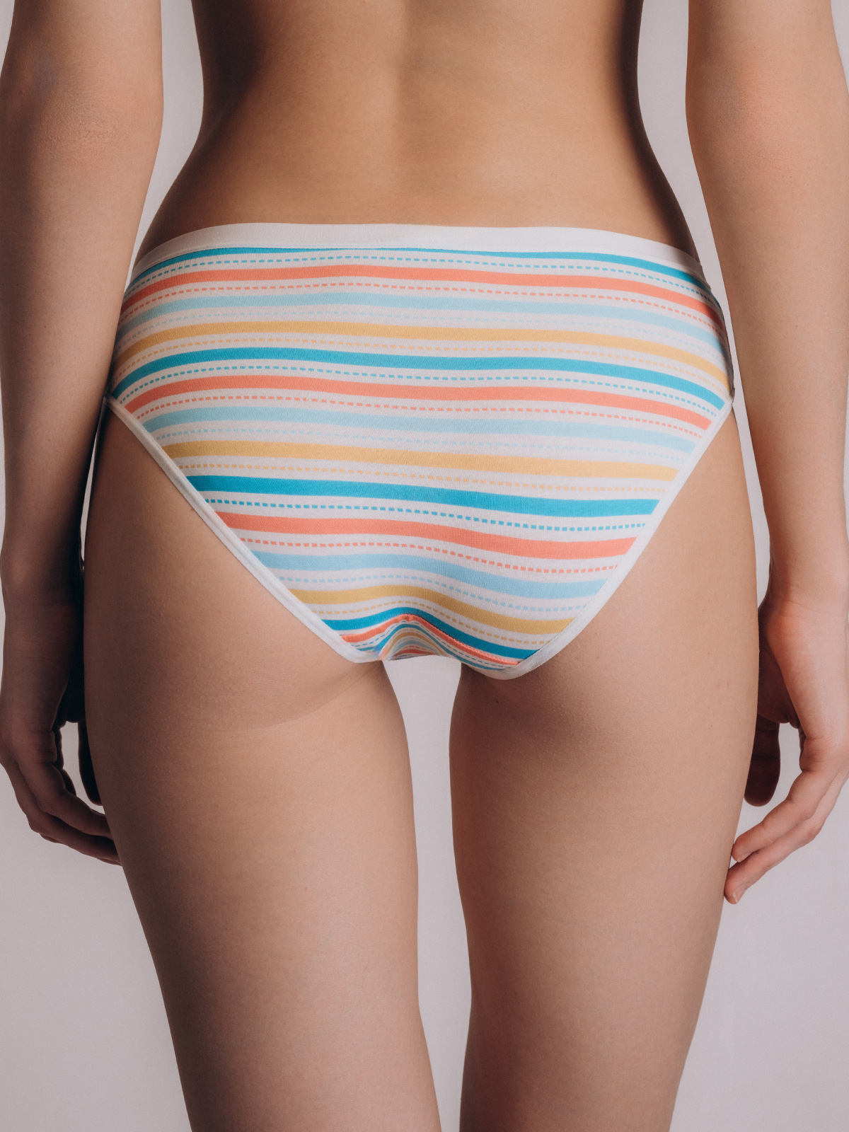 Яркие трусы-слипы от бренда Indefini с разноцветным полосатым принтом. Модель выполнена из мягкого хлопка с добавлением эластана, что обеспечивает отличную посадку и комфорт в течение дня. Эластичная резинка мягко фиксирует изделие на талии, не сдавливая кожу.