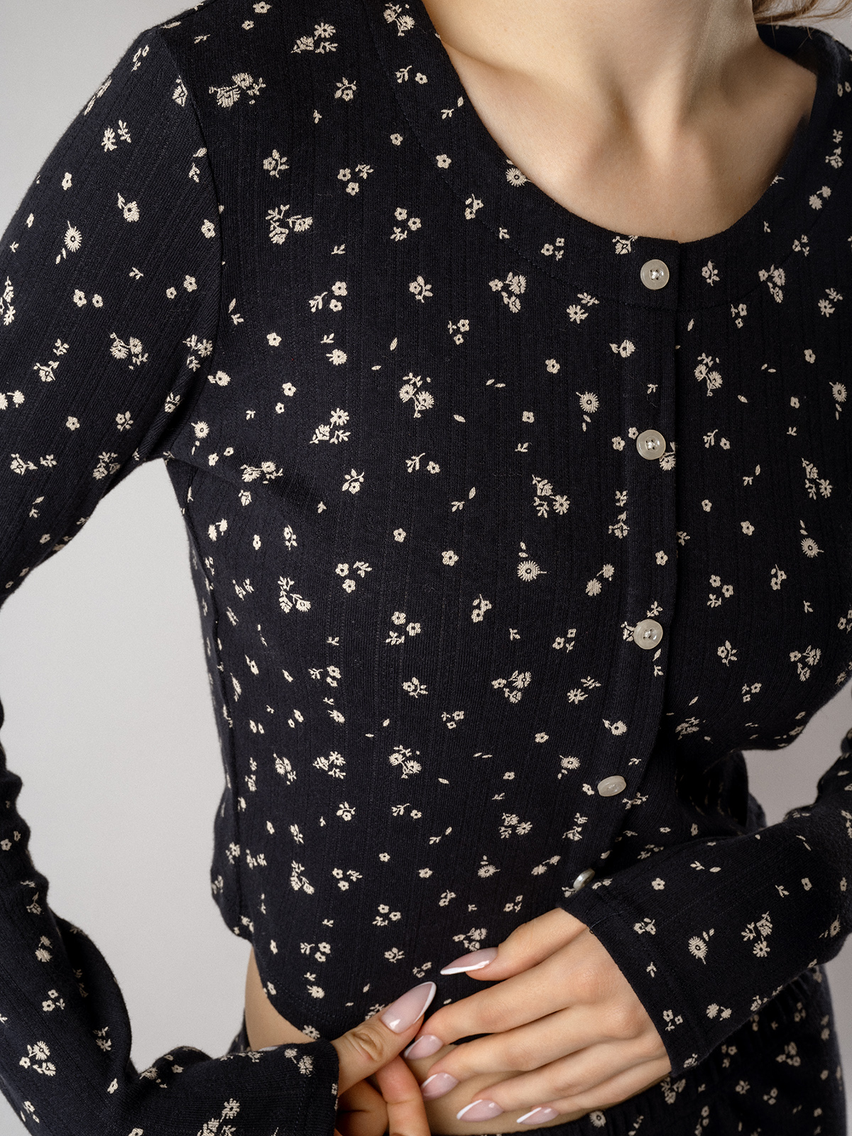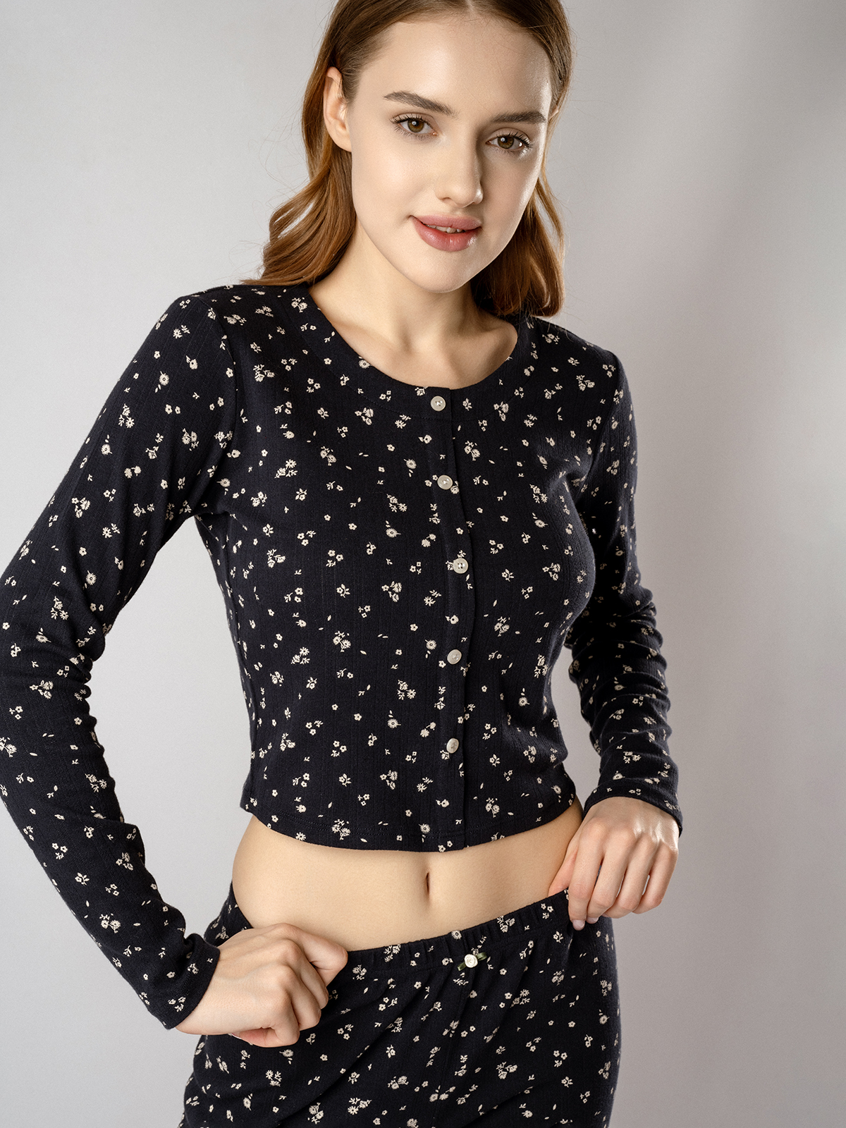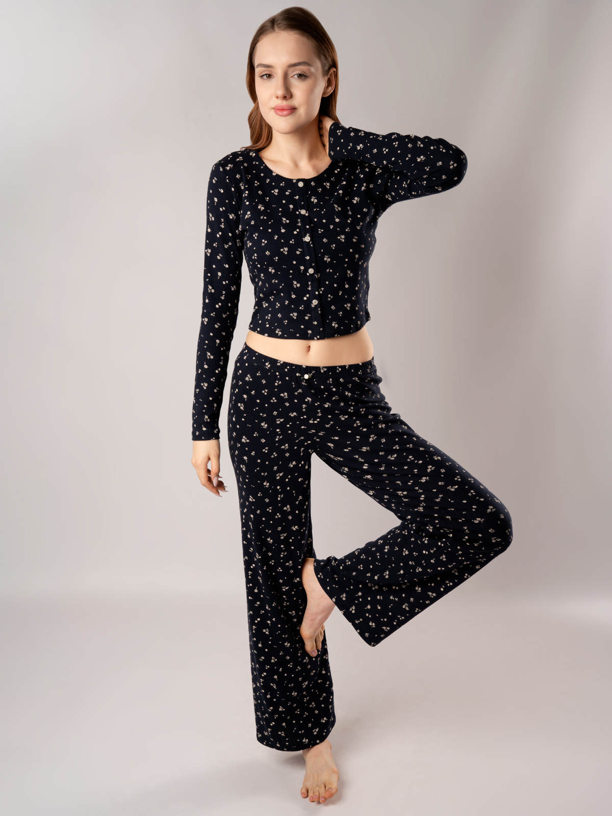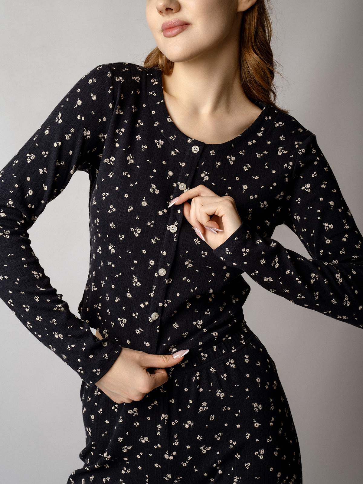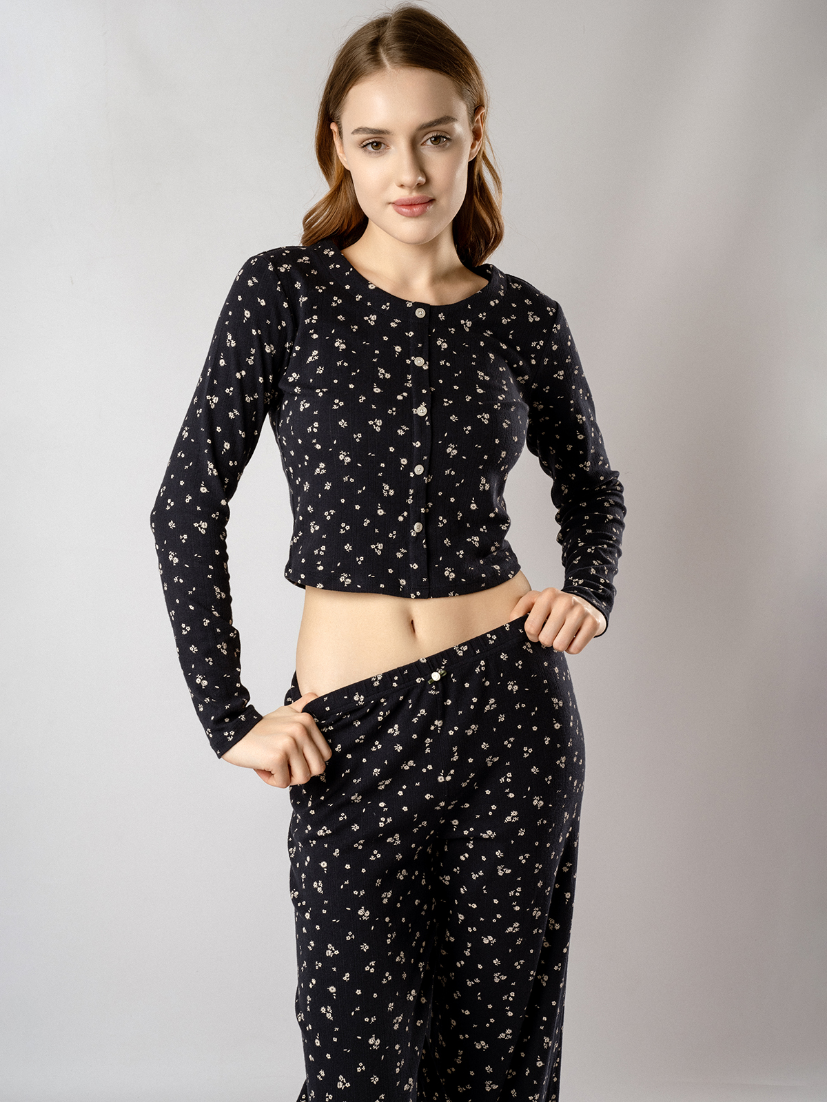 Домашний костюм сшит из ажурной хлопковой ткани с добавлением эластана и украшен нежным цветочным принтом. Такая хлопковая пижама мягкая, приятная к телу и не сковывает движения, сохраняет форму после стирки.