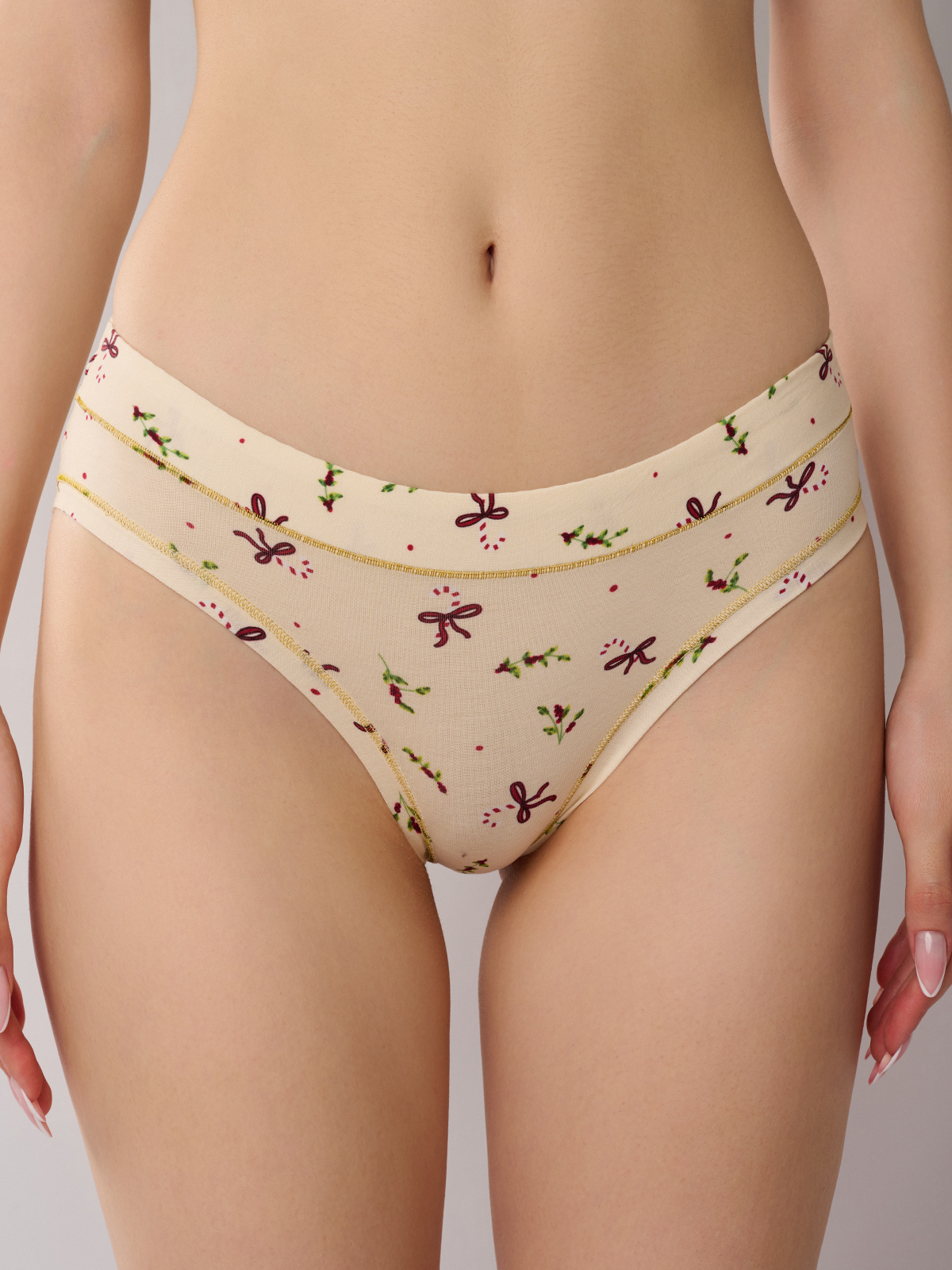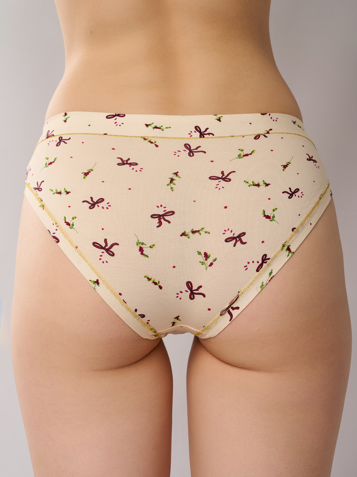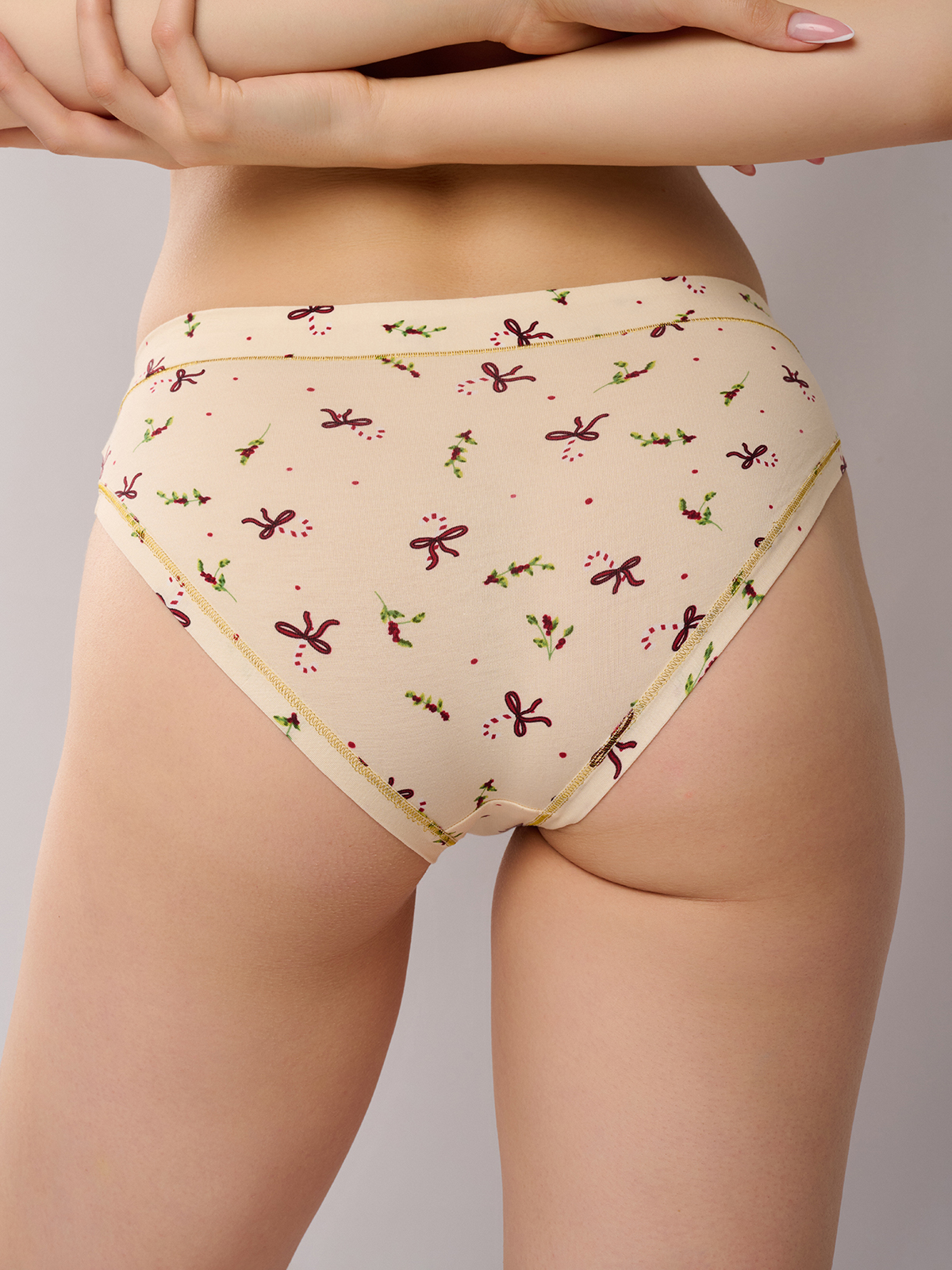 Выполнены в нежном бежевом оттенке с изящным принтом в виде бантиков и веточек.