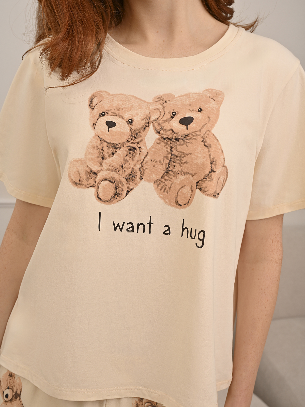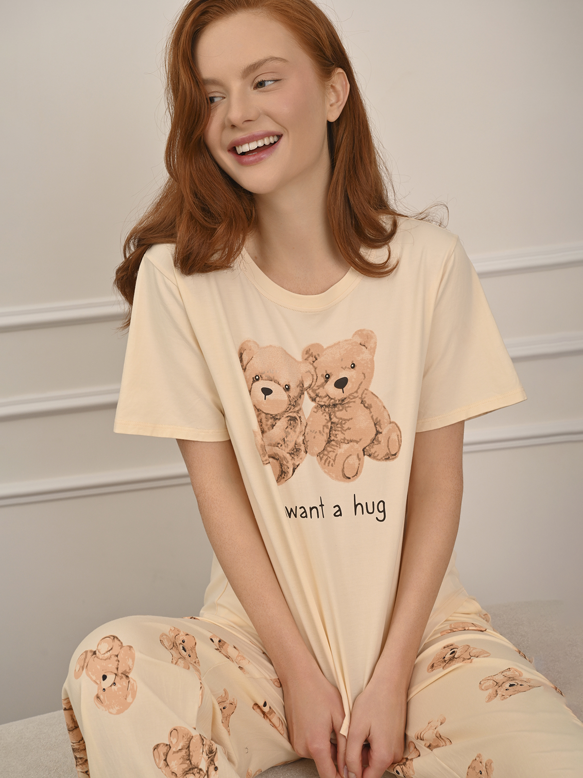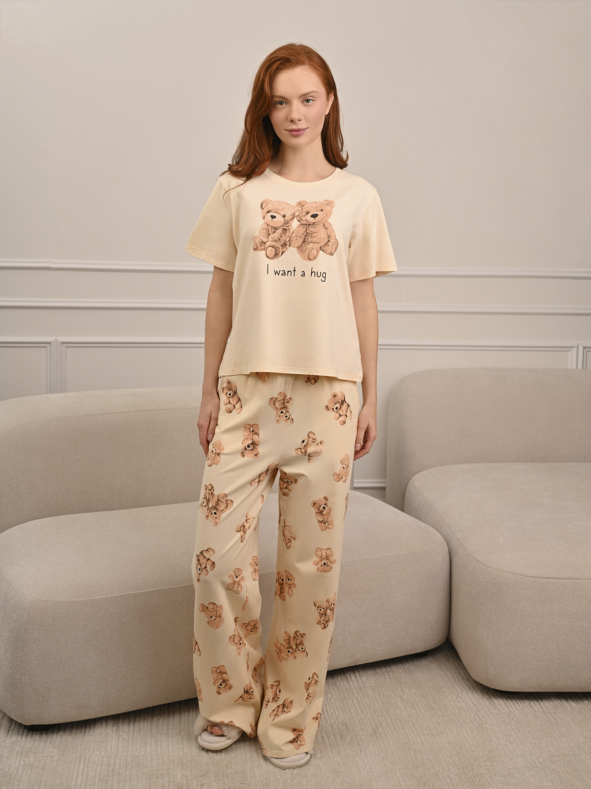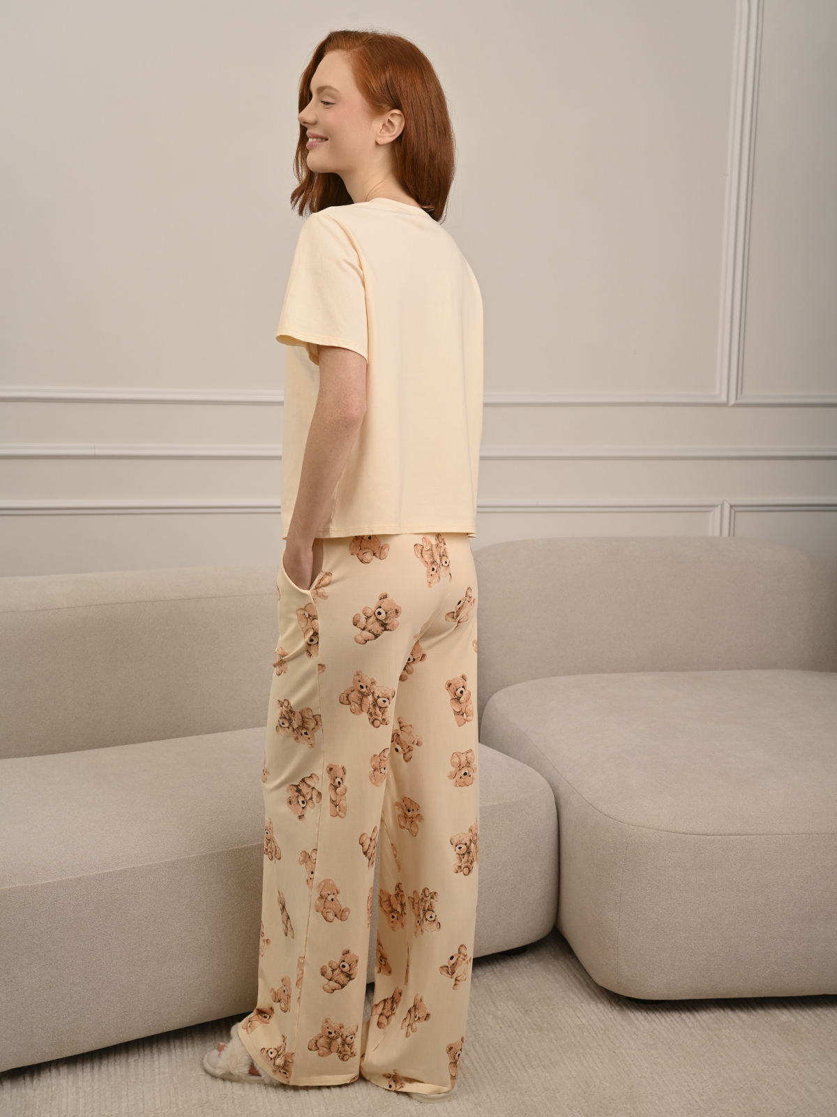 Хлопковая женская пижама с брюками — мягкая, дышащая, в ней комфортно спать и проводить время дома. Нежный цвет и милый принт дарят пижаме нежный, женственный характер. Брюки широкие, с глубокими карманами. Мягкая резинка не натирает, а небольшое количество эластана в составе делает белье долговечным и эластичным. Параметры модели: 83-63-89 см Рост: 178 см