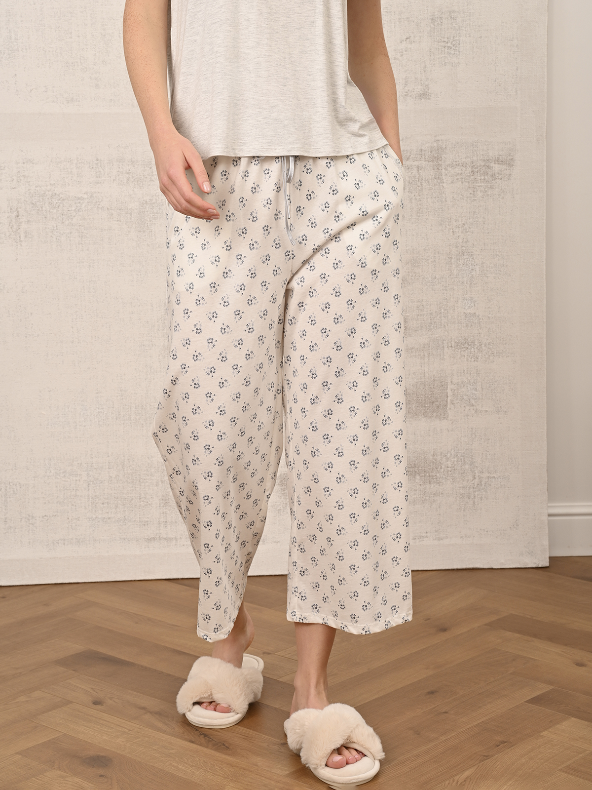 Хлопковая женская пижама с брюками — мягкая, дышащая, в ней комфортно спать и проводить время дома. Нежный цвет и милый принт дарят пижаме нежный, женственный характер. Брюки широкие, с глубокими карманами. Мягкая резинка не натирает, а небольшое количество эластана в составе делает белье долговечным и эластичным. Параметры модели: 83-63-89 см Рост: 178 см