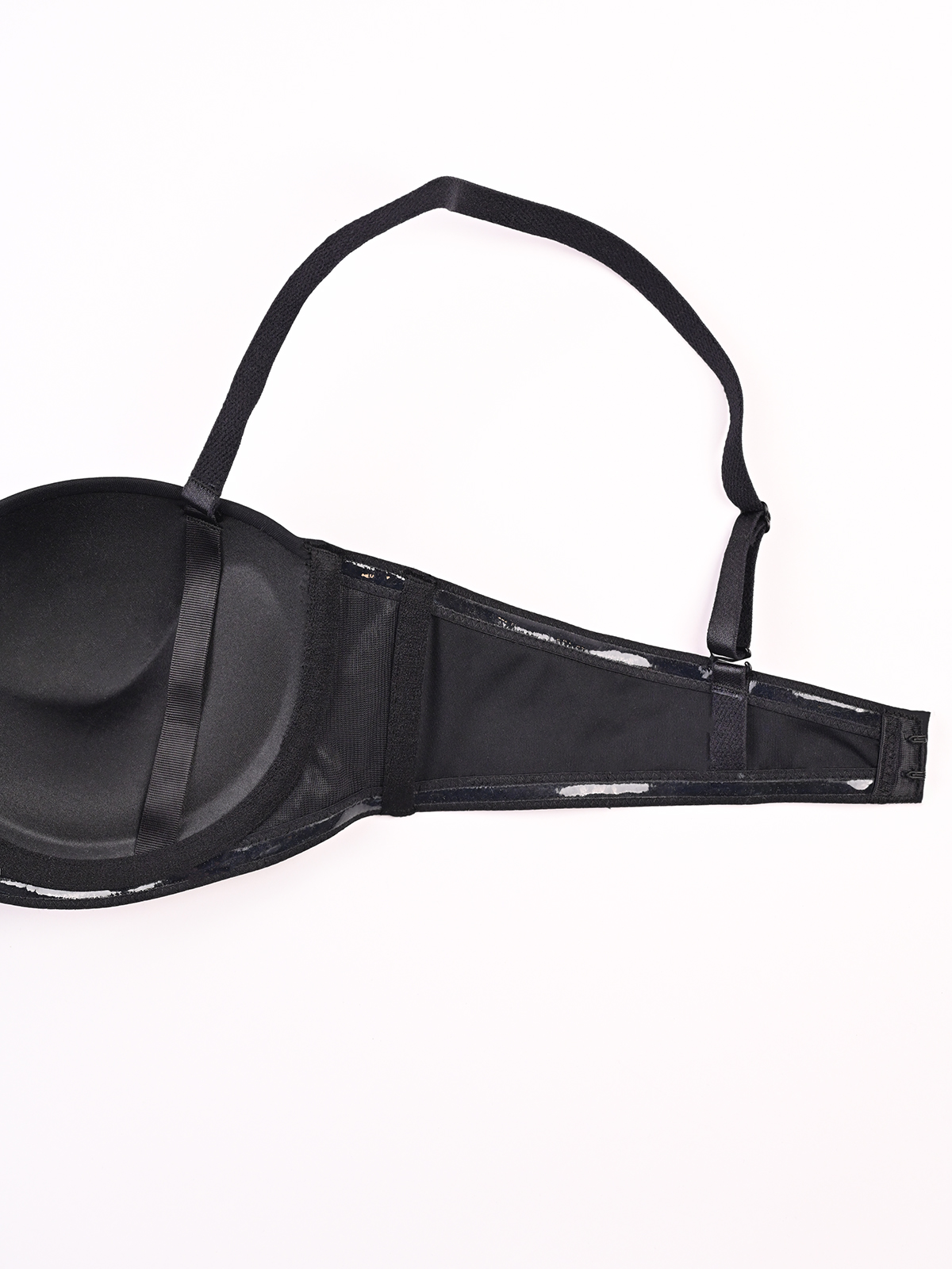 Бюстгальтер черного цвета с эффектом PUSH UP. Поддерживает и приподнимает грудь. Силиконовая лента не дает бюстгальтеру сползать или «гулять» по телу, особенно при активных движениях. Можно носить без бретелей — бюстгальтер держится за счет силиконовых элементов и конструкции чашек.