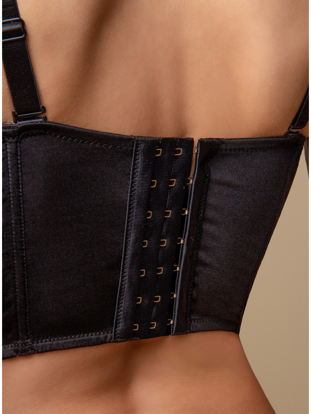 Чашечки корсета выполнены из тоного паралона, остальная часть из черного полупрозрачного полиамида с эластаном. Корсет держит форму благодаря планшетным костям расположенные вертикально по ребрам.