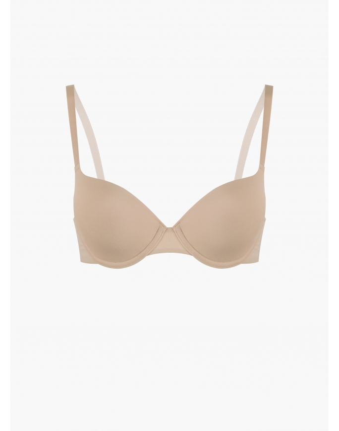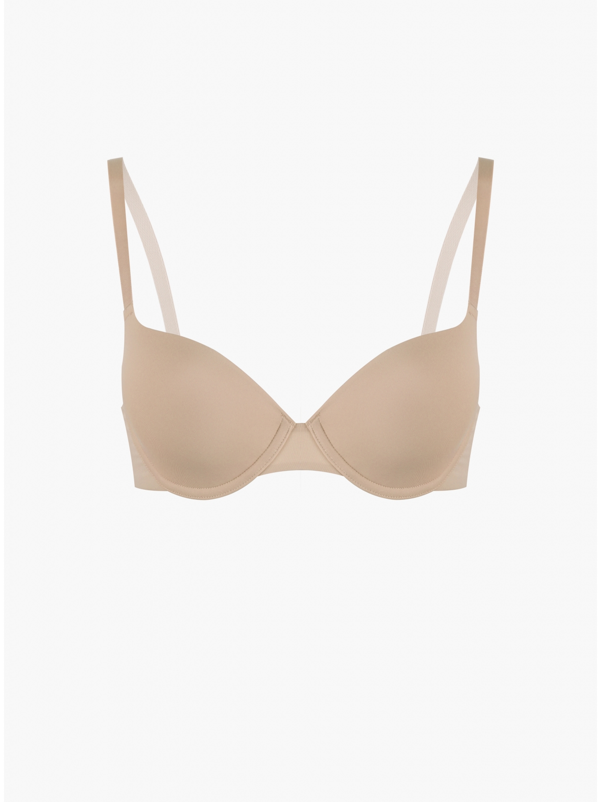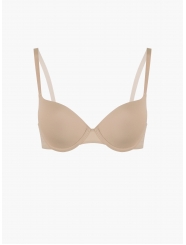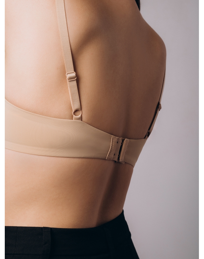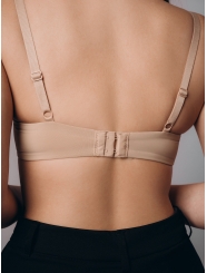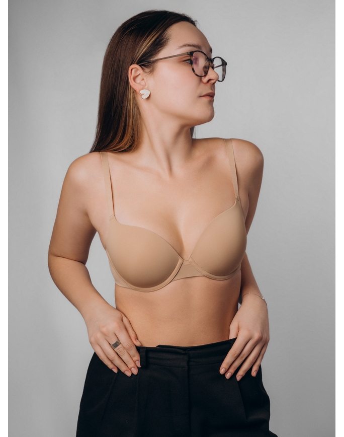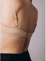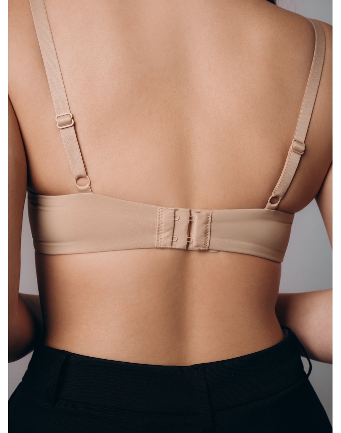 Базовый бежевый бюстгальтер на косточках изготовлен из полиамида, мягкой и эластичной ткани. Тонкие поролоновые чашки на косточках создают естественную форму без эффекта push-up. Тонкие регулируемые бретели равномерно распределяют нагрузку на плечи, застежка на крючках сзади позволяет настроить необходимую посадку.
