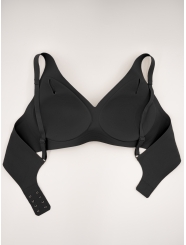 Базовый бюстгальтер без косточек изготовлен из полиамида и выполнен в классическом черном цвете. Поролоновые чашки имеют небольшой Push-up, тонкие бретели регулируются. Сзади бюстгальтер застёгивается на крючки.