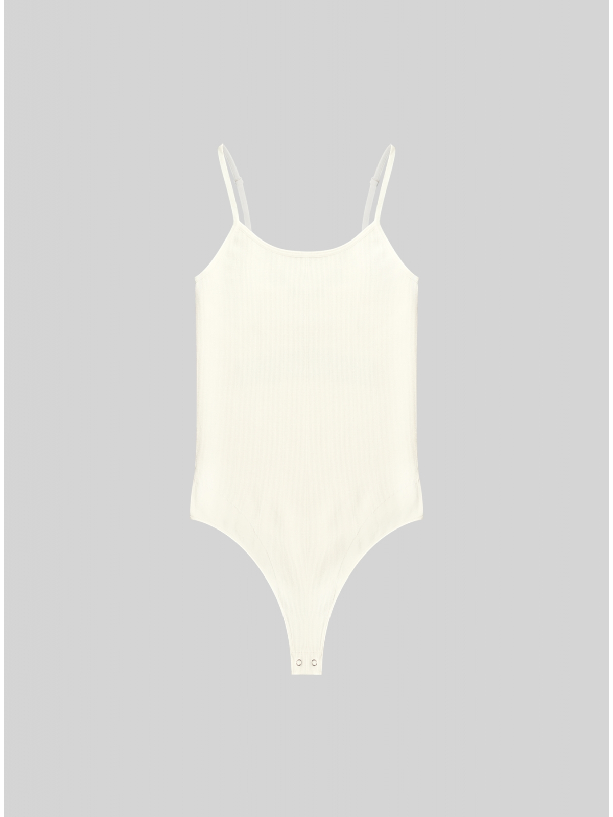 Боди от торговой марки Индефини. Боди молочного цвета, выполнено из микрофибры с фактурным плетением в рубчик без боковых швов, на тонких регулируемых бретелях с округлым вырезом горловины, вырезы, пройма и горловина окантованы бейкой в рубчик. Низ изделия выполнен в виде трусов-стринг и дополнен застежкой на кнопках.