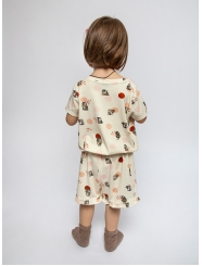 Детская пижама от торговой марки Индефини. В комплекте футболка с шортами. Футболка из бамбука, бежевого цвета, с принтом и надписями, с короткими рукавами, свободного кроя. Шорты из бамбука, бежевого цвета, с принтом, с обрамлением из рюш, на мягкой резинке с регулирующей лентой-шнурком.