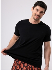 Домашняя футболка от торговой марки Индефини. Трикотажная черная футболка свободного кроя из дышащей, легкой 100% хлопковой ткани с гладкой фактурой. С классическим круглым вырезом горловины без воротника, с короткими рукавами с закрепленными отворотами, со спущенной линией плеча.
