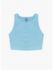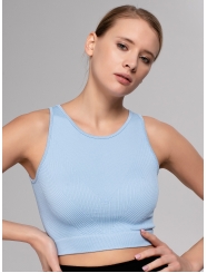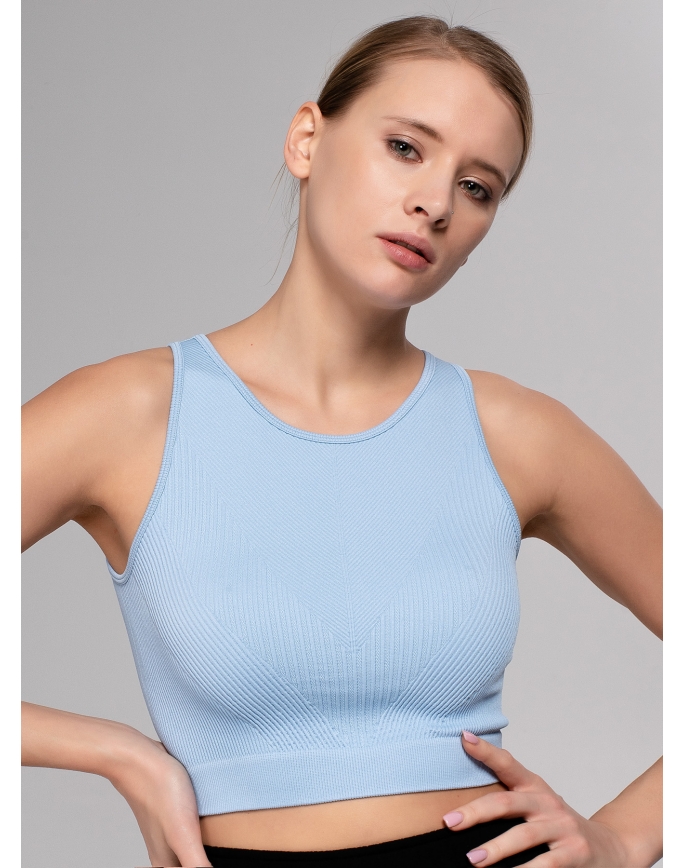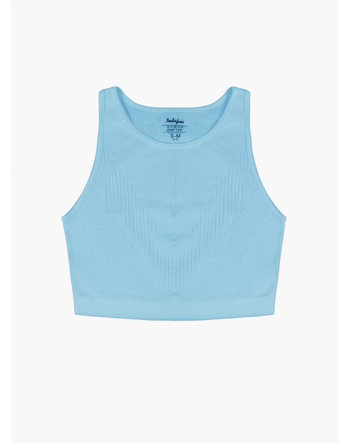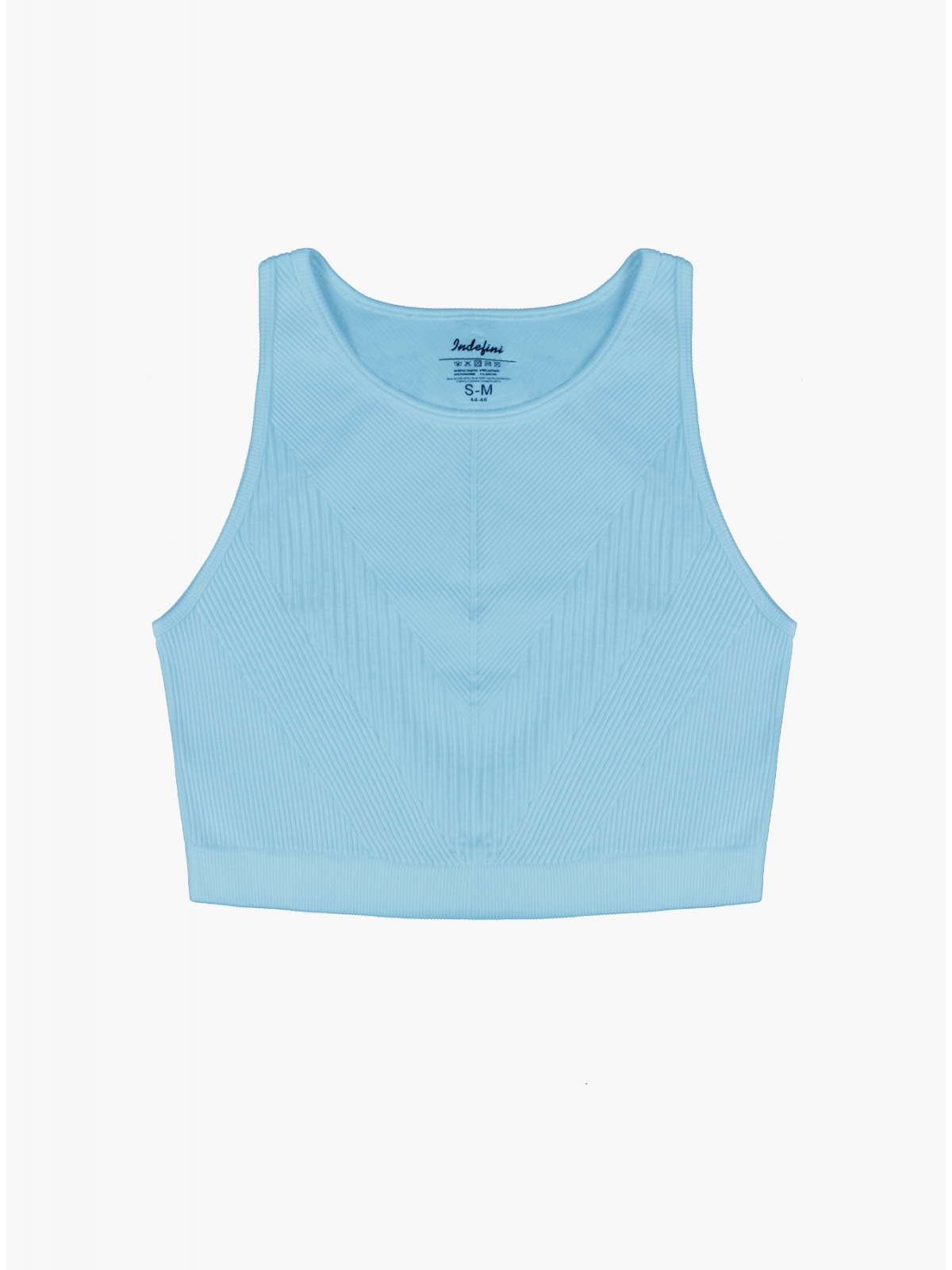 Женский топ от торговой марки Индефини. Топ из полиамида, голубого цвета, в рубчик, с принтом, на резинке, укороченный.