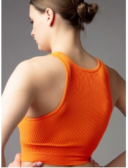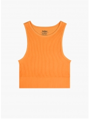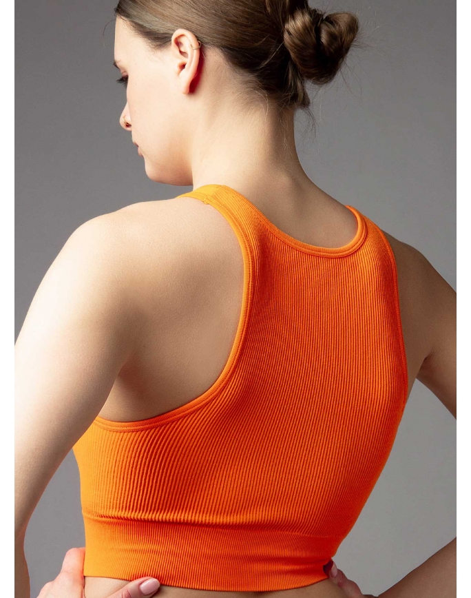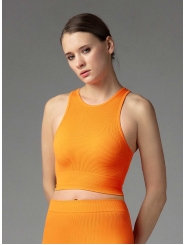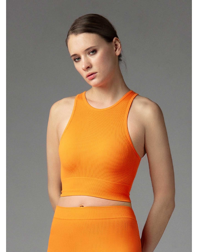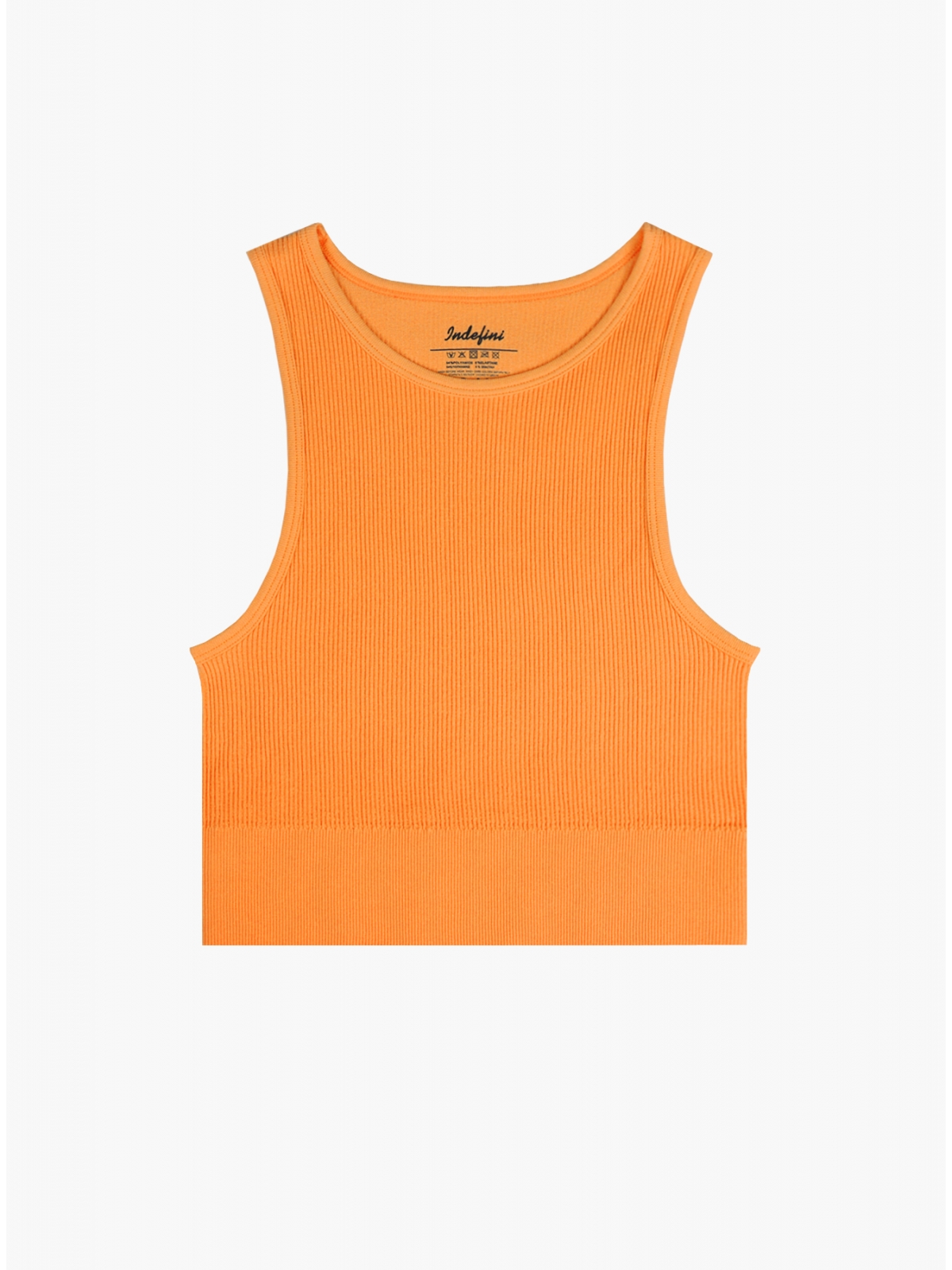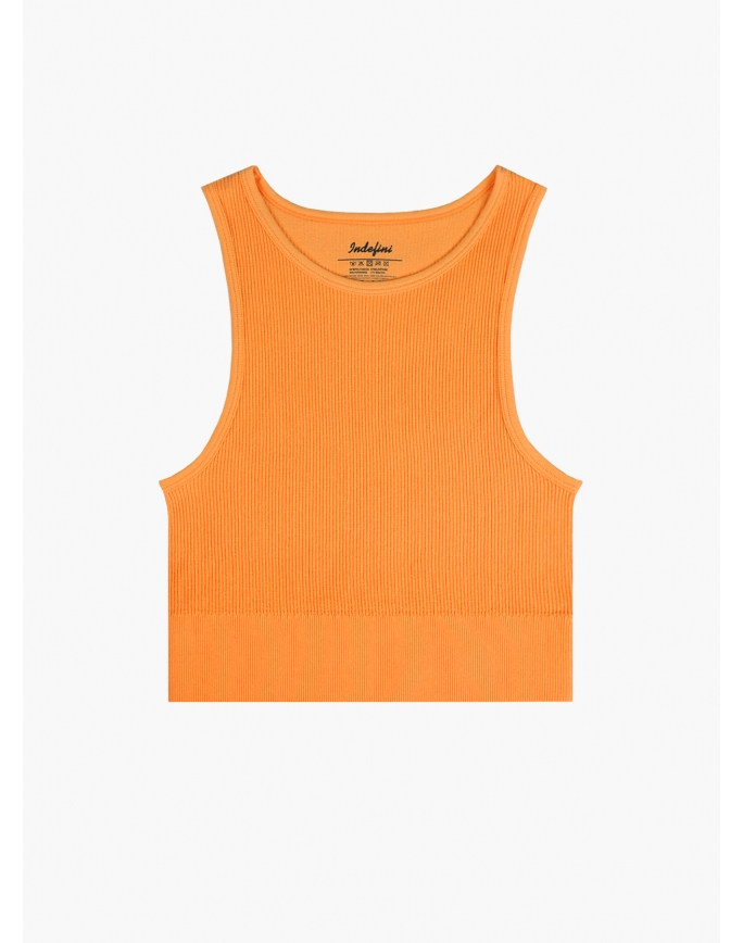 Женский топ от торговой марки Индефини. Топ из полиамида, оранжевого цвета, в рубчик, на резинке, укороченный.