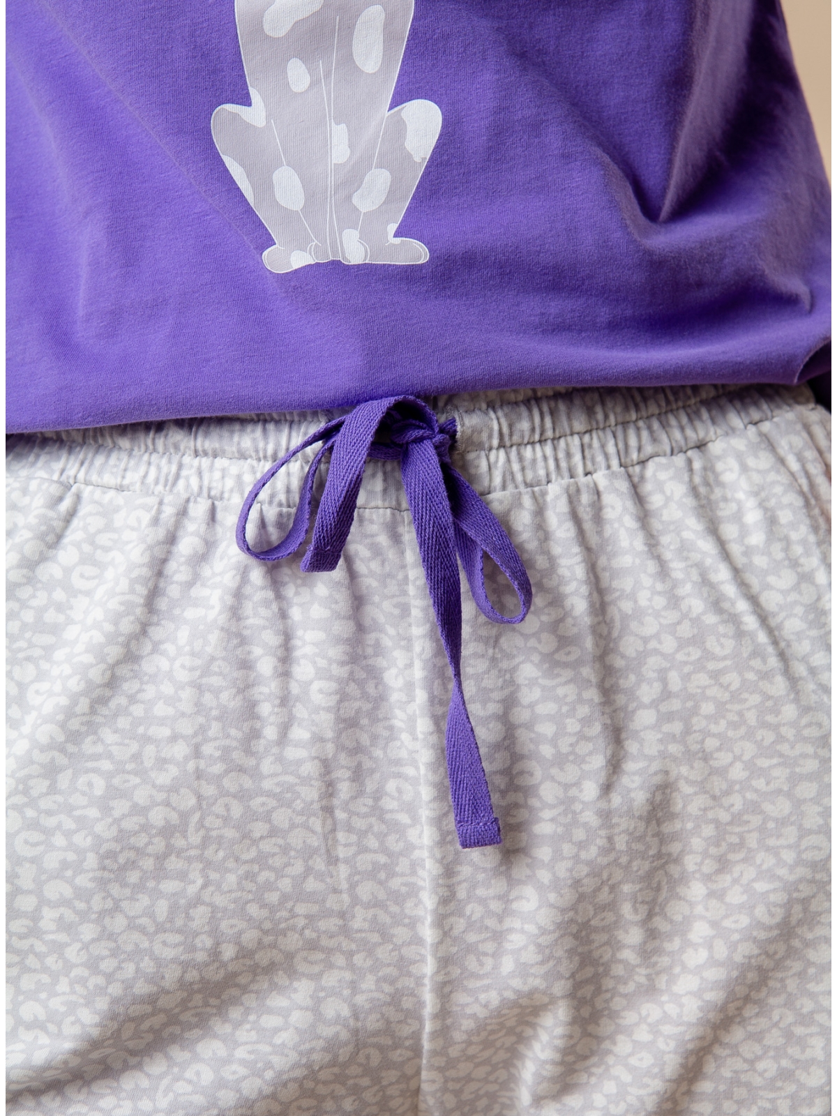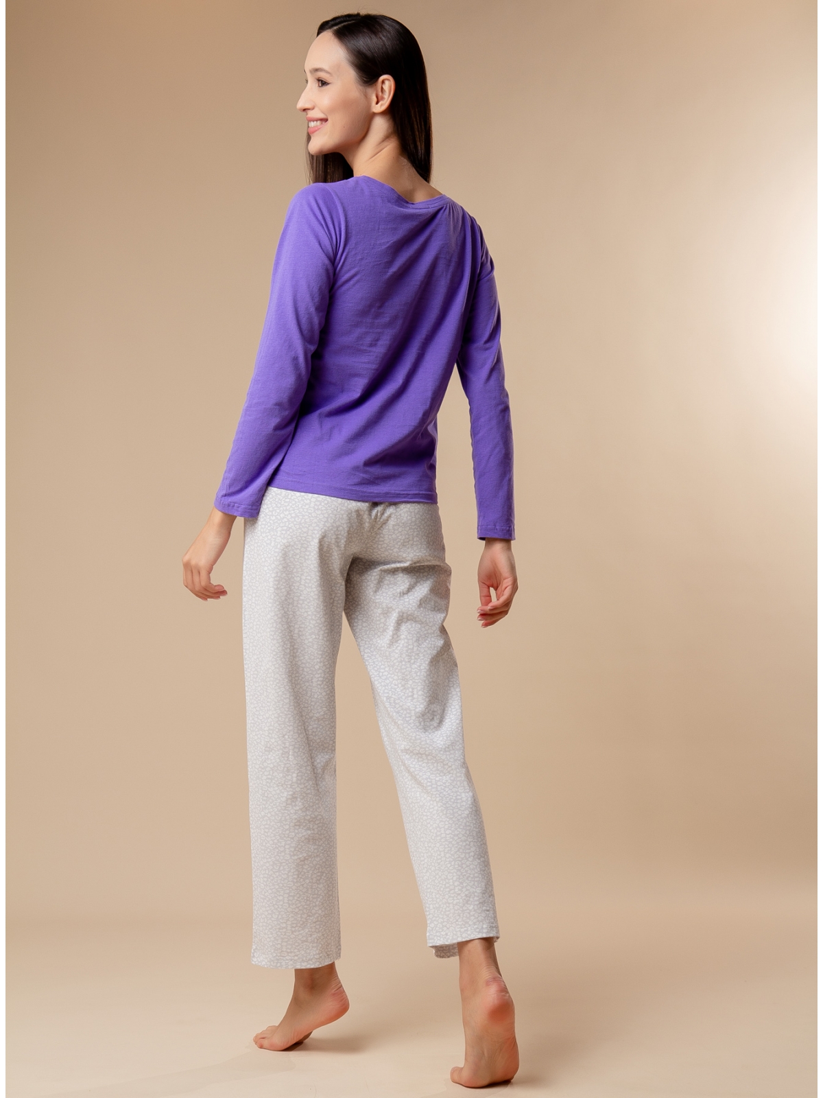 Домашняя пижама (Арт.3228TCC) от торговой марки Индефини. В комплекте кофта и брюки. Кофта из хлопка, фиолетового цвета, с принтом и надписью, с длинными рукавами, прямая, свободного кроя. Брюки из хлопка, серого цвета, свободного кроя, на мягкой резинке, с регулирующим шнурком.