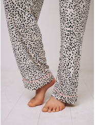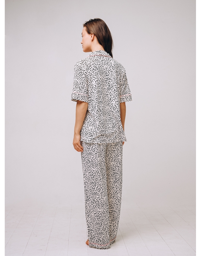 Пижама женская, изготовленная из мягкой тянущейся вискозы, нежно окутывает кожу, обеспечивая уют во время носки. Комплект включает прямую футболку с отложным воротником, нагрудным карманом и пуговицами в тон ткани. Свободные прямые брюки на эластичной резинке надежно сидят на талии. Анималистичный принт придаёт женской пижаме яркий и современный акцент.