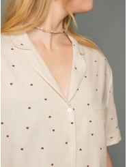 Пижама женская, изготовленная из хлопковой ткани, содержит футболку свободного кроя с отложным воротником и короткими рукавами. Прямые брюки на мягкой эластичной резинке надежно сидят на талии. Пижама женская украшена принтом с изображением сердечек.