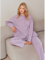 Пижама женская, изготовленная из хлопковой ткани, включает рубашку и брюки. Рубашка свободного кроя с отложным воротником, длинными рукавами и застегивающимися пуговицами спереди и на манжетах. Брюки прямого свободного кроя с боковыми карманами и на мягкой эластичной резинке на талии обеспечивают удобство и свободу движений во время носки, надежно фиксируясь на теле. Пижама украшена принтом в полоску.