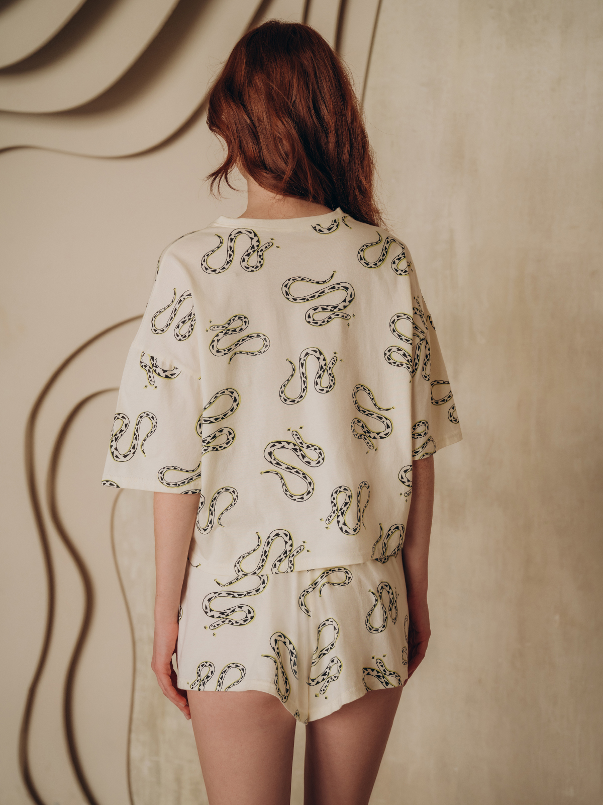 Пижама женская молочного цвета изготовлена из хлопкового трикотажа. Пижама состоит из футболки и шорт. Футболка имеет короткие рукава, прямой крой и округлый вырез. Шорты крепко держатся на талии благодаря эластичной резинке. Пижама украшена анималистичным принтом с изображением змей, на футболку спереди нанесена надпись «Medusa».