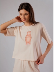 Пижама женская изготовлена из хлопкового трикотажа и выполнена в персиковом цвете. Пижама состоит из футболки свободного кроя с короткими рукавами и округлым вырезом. Шорты имеют мягкую резинку и шнурок, позволяющий регулировать степень обхвата талии. На футболку нанесен принт с изображением медведя, имеющий обрамление в виде вышивки.