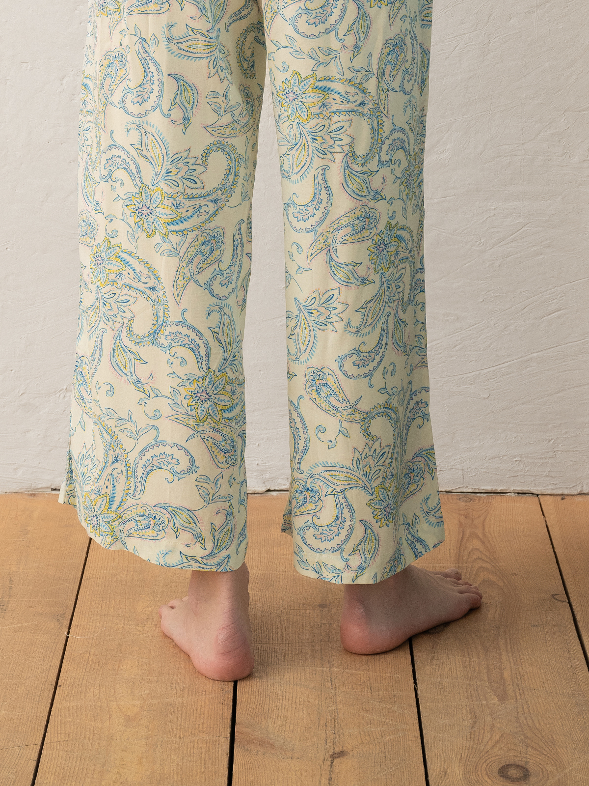 Пижама женская состоит из футболки и брюк. Футболка прямого свободного кроя изготовлена из бамбукового трикотажа и выполнена в классическом белом цвете. Имеет короткие рукава и V-образный вырез в зоне декольте, обрамленный кружевом, застёгивающийся на две пуговицы. Брюки прямого свободного кроя изготовлены из вискозной ткани, имеют мягкую тянущуюся резинку на талии с регулирующим шнурком. Брюки дополнены боковыми карманами и украшены цветочным принтом.