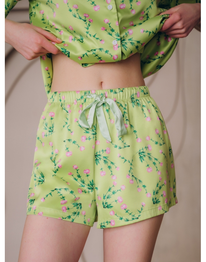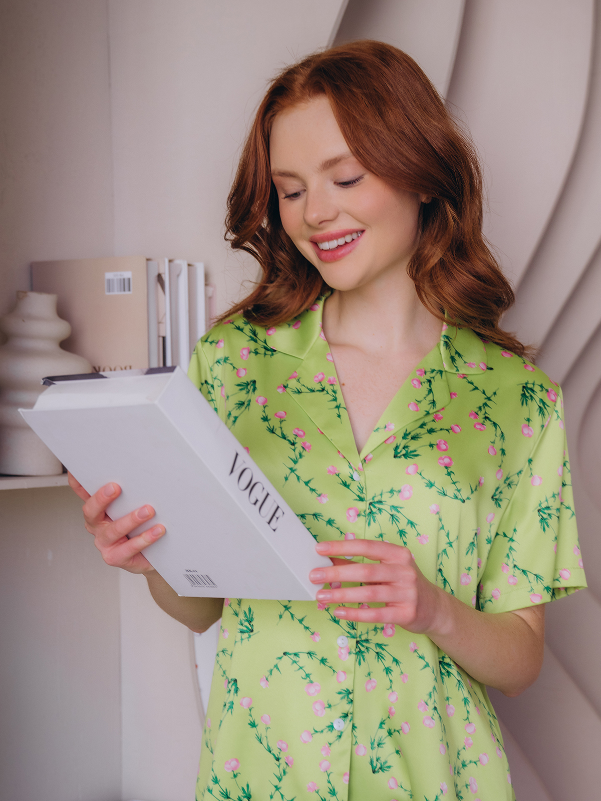 Домашняя пижама от торговой марки Индефини. В комплект входит рубашка и шорты. Рубашка из полиэстера, зеленого цвета, с цветочным принтом, с короткими рукавами, с воротником-отворотом, на пуговичках, прямая, свободного кроя. Шорты из полиэстера, зеленого цвета, с цветочным принтом, с обрамлением, прямые, свободного кроя, на мягкой резинке, с регулирующей атласной лентой.