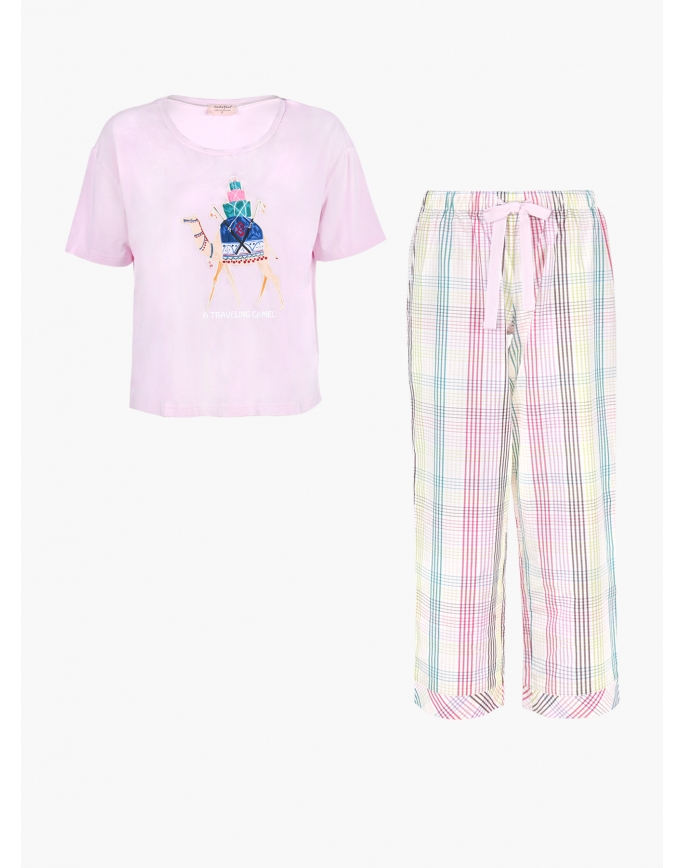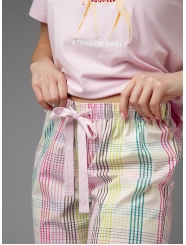 Домашняя одежда от торговой марки Индефини. В комплекте футболка с брюками. Футболка из бамбука и хлопка, розового цвета, с принтом, с принтом-надписью, с короткими рукавами, свободного кроя, укороченная. Брюки из хлопка, белого цвета, с принтом в разноцветную полоску, с обрамлением понизу, с регулирующим шнурком, на мягкой резинке.