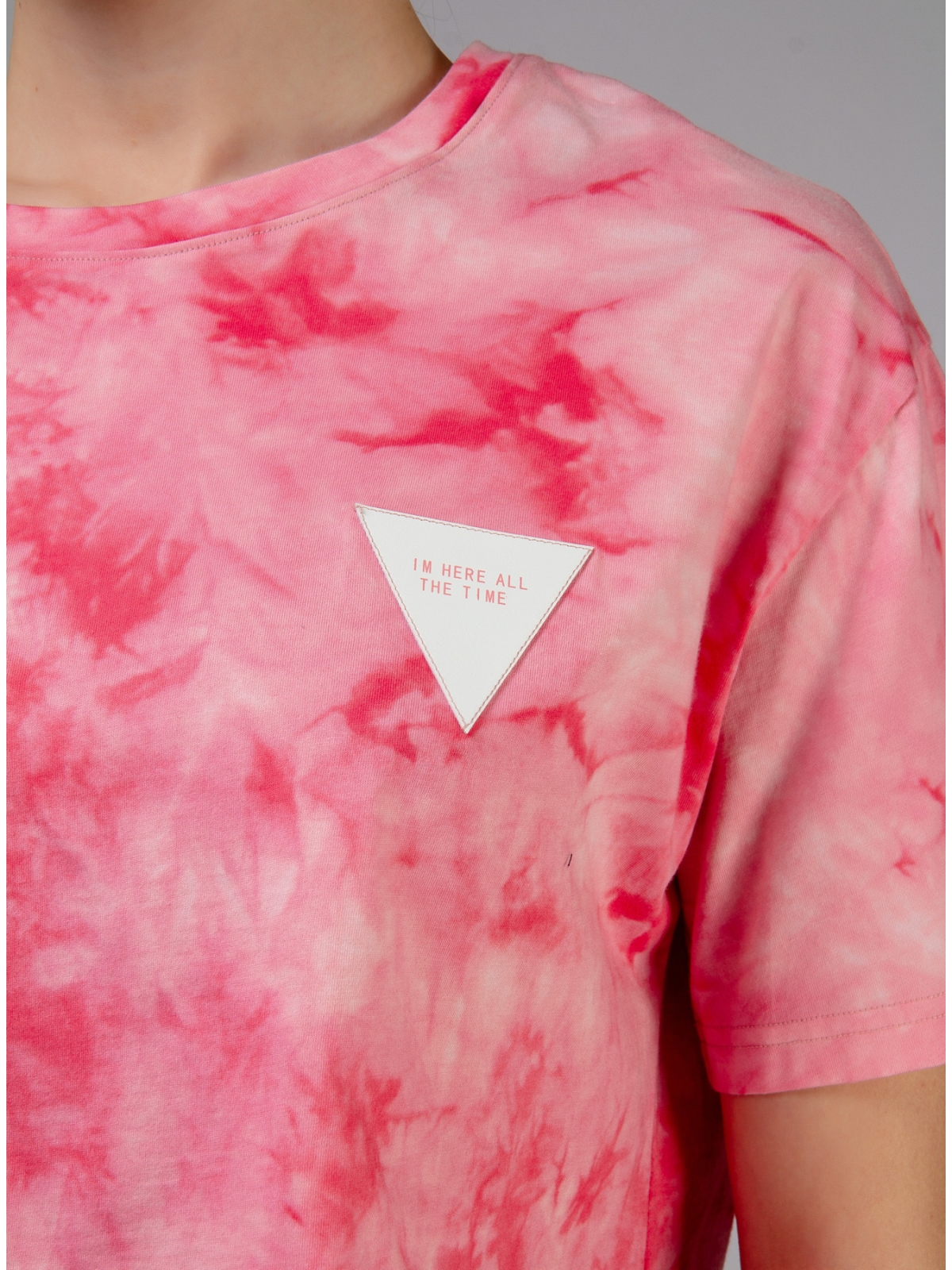 Домашняя пижама от торговой марки Индефини. В комплекте футболка и шорты. Футболка из хлопка, розового цвета, с принтом, с короткими рукавами, укороченная, прямая, свободного кроя. Шорты из хлопка, розового цвета, с принтом, с карманами, прямые, свободного кроя, на мягкой резинке, с регулирующим шнурком.