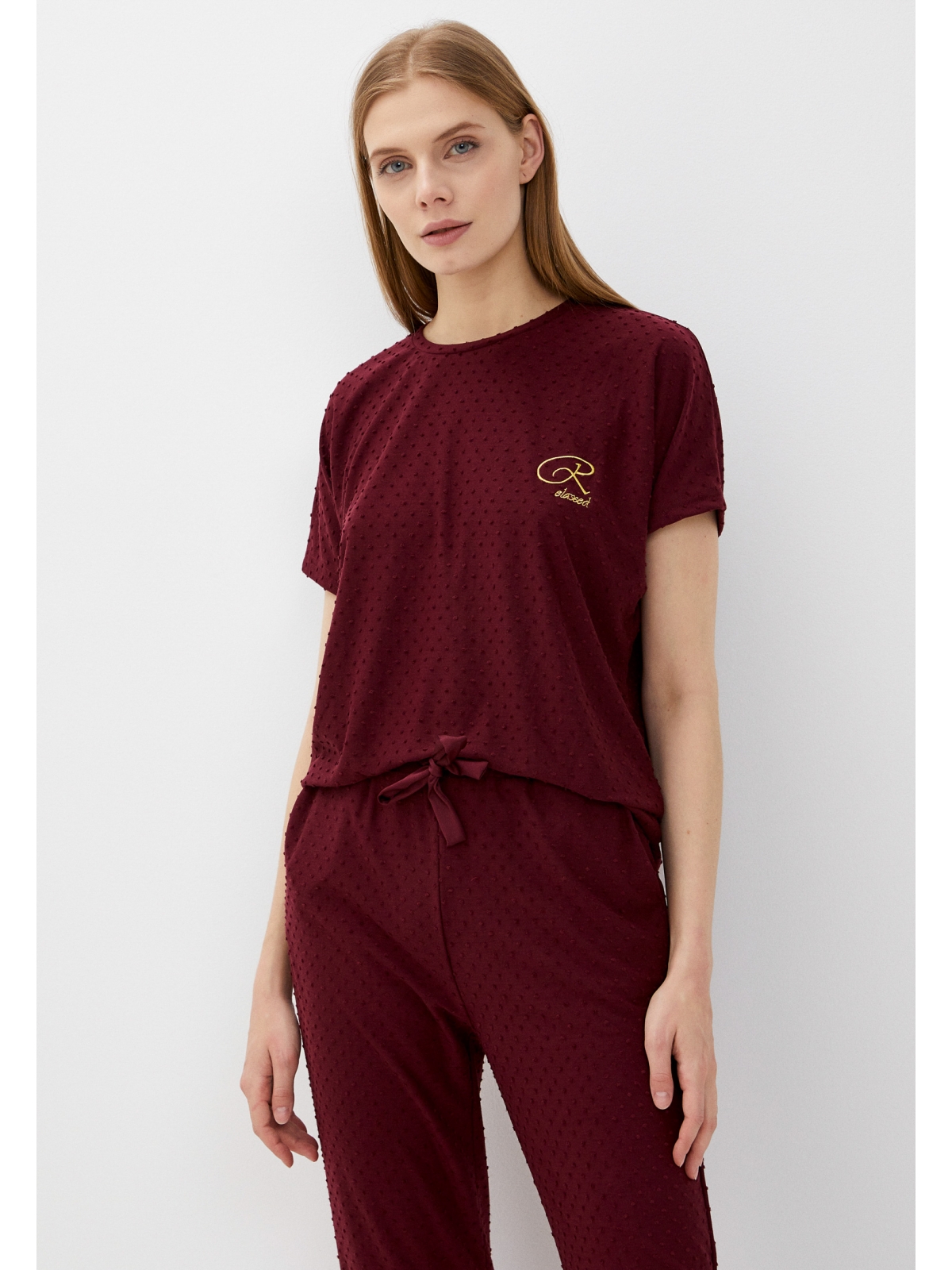 Домашняя одежда от торговой марки Индефини. В комплекте футболка с брюками. Футболка бордового цвета, с короткими рукавами, с текстурным принтом и принтом-нашивкой, прямой силуэт, свободного кроя. Брюки бордового цвета, штанины с манжетами, с кармашками, прилегающие, на мягкой резинке с регулирующей атласной лентой.