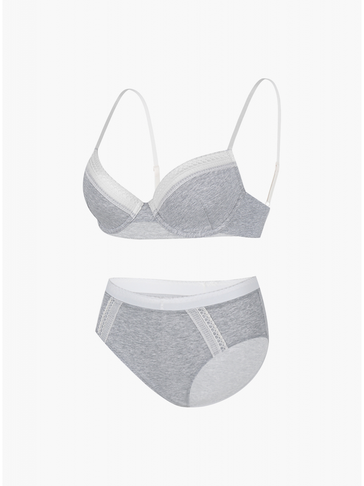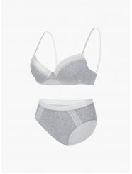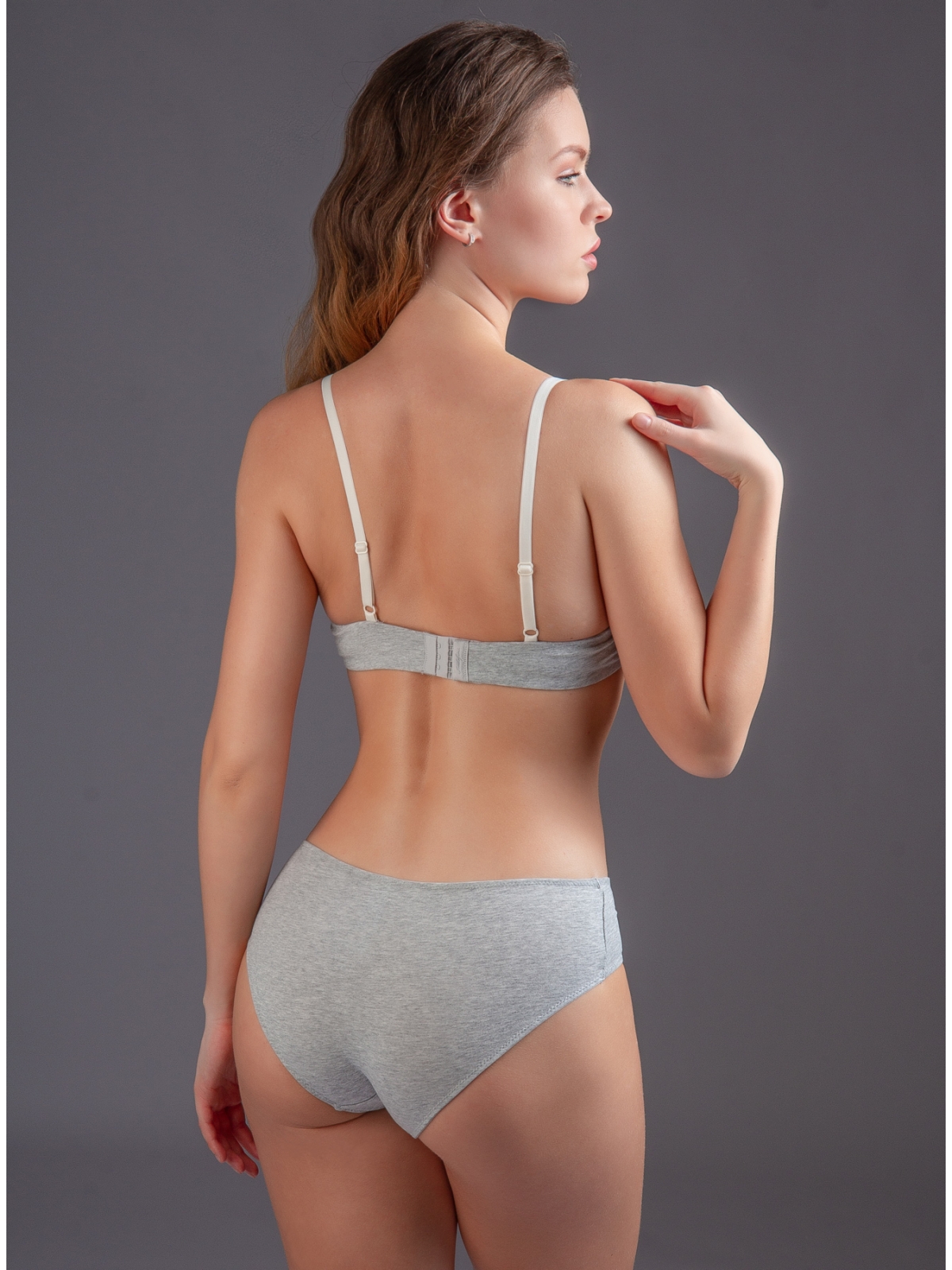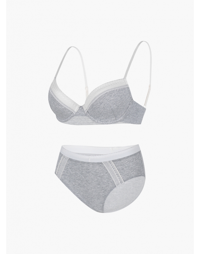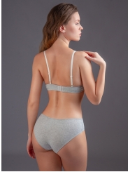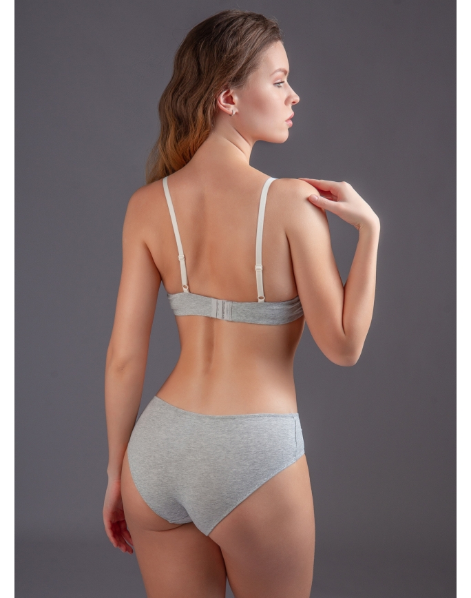 Комплект нижнего белья от торговой марки Индефини. В комплекте бюстгальтер и трусики. Бюстгальтер серого цвета изготовлен из хлопка с небольшим добавлением эластана и с кружевными вставками, с формованной чашкой без Push-up на косточках, на тонких регулируемых бретелях, пояс фиксируется застежками-крючками. Трусы-слипы средней посадки серого цвета изготовлены из хлопка с кружевными вставками, на мягкой резинке.