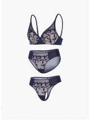 Комплект нижнего белья от торговой марки Индефини. В комплекте бюстгальтер и двое трусиков. Бюстгальтер из полиамида, синего цвета с бежевым, на косточках, без Push-up, с кружевным принтом, со вставками из микросетки, на регулируемых лямках. Трусики, стринги и слипы, синего цвета, с цветочным принтом из кружева, со вставками из микросетки, на мягкой резинке.