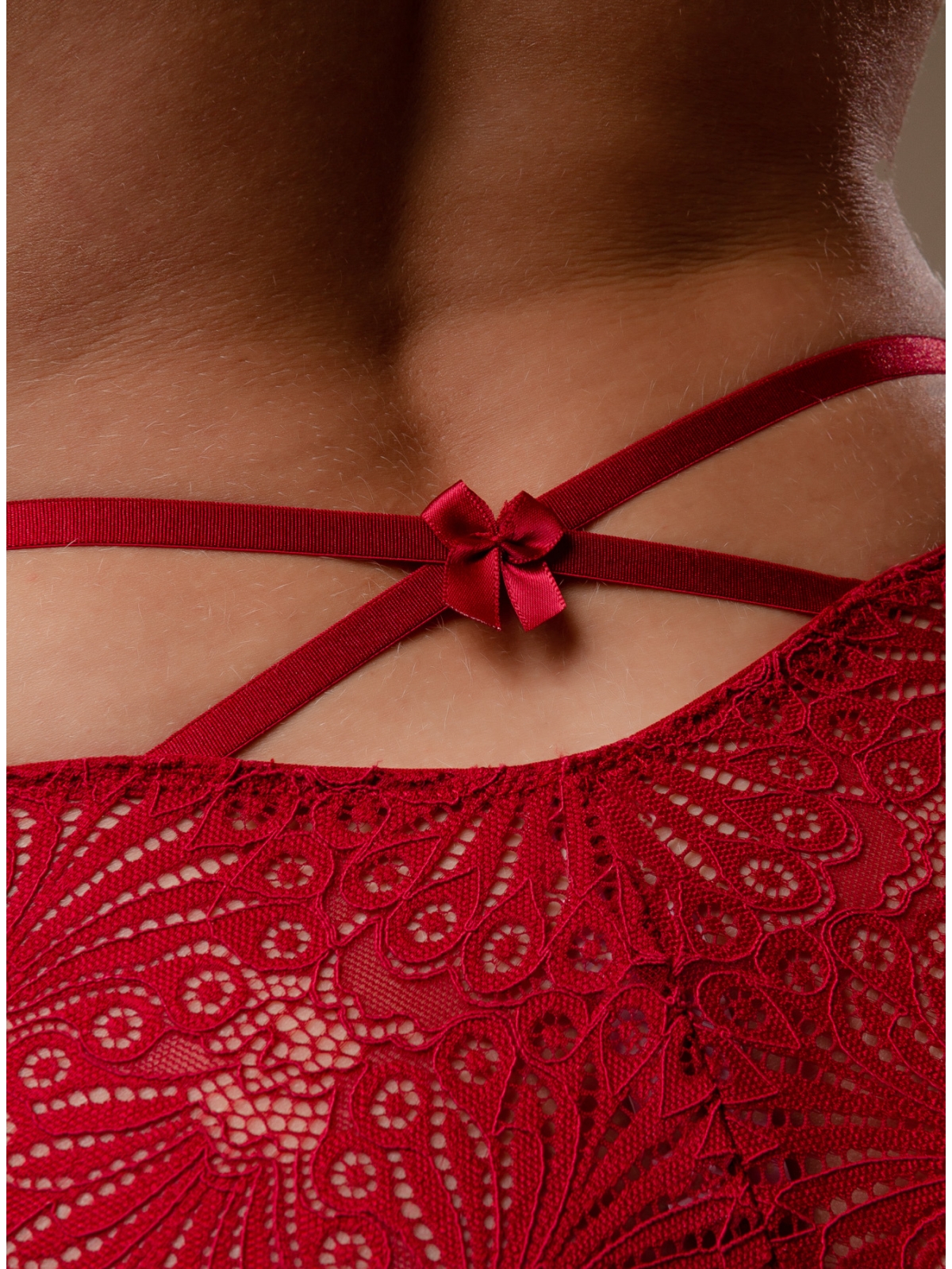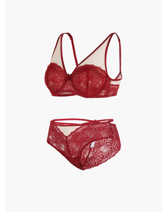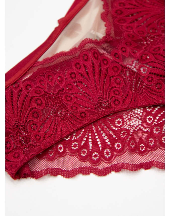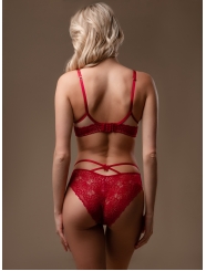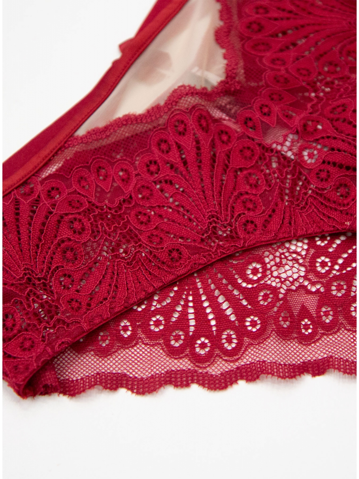 Комплект нижнего белья от торговой марки Индефини. В комплекте бюстгальтер и трусики. Бюстгальтер из кружевной ткани, красного цвета, с декором, на косточках, с небольшим Push-Up, на кружевном поясе, с застежками-крючками, на регулируемых лямках. Трусики-слипы красного цвета, с декором, из кружевной ткани, со вставками из микросетки, на мягкой резинке.