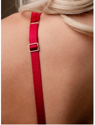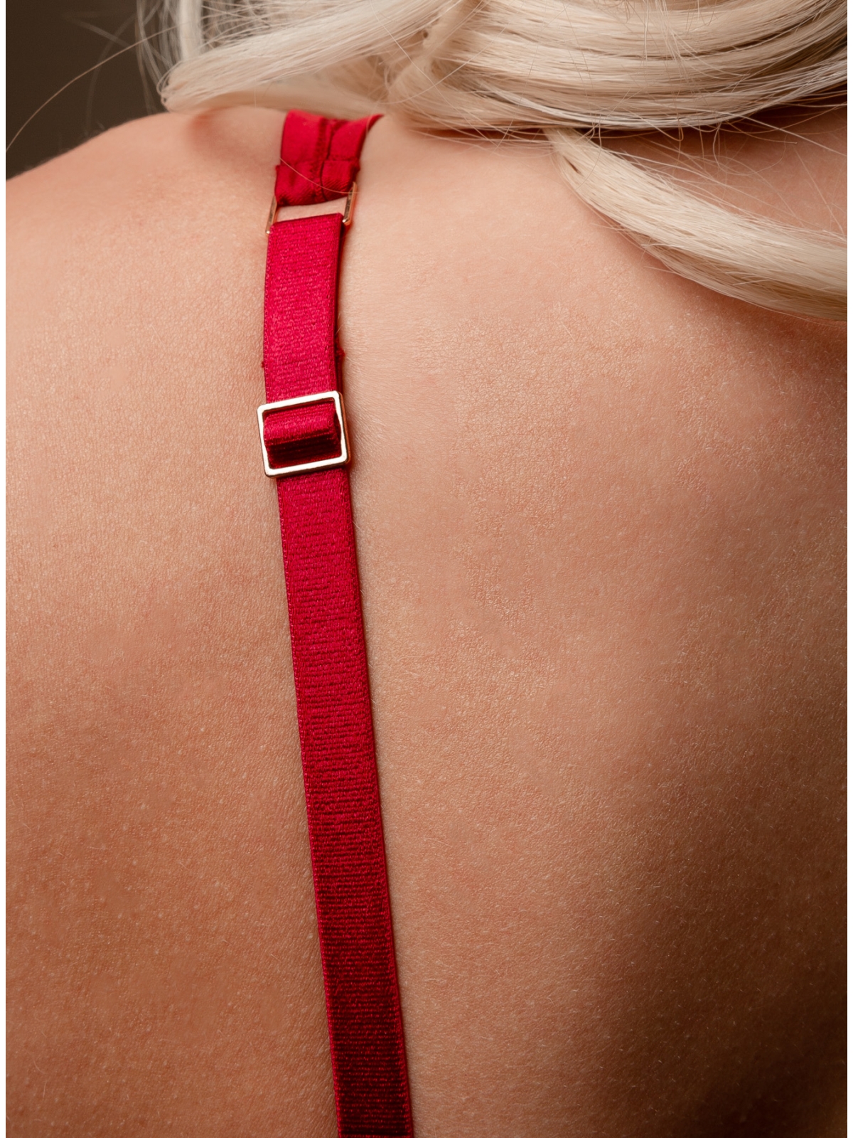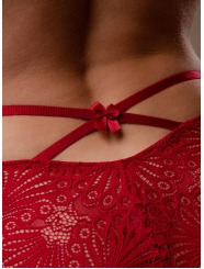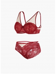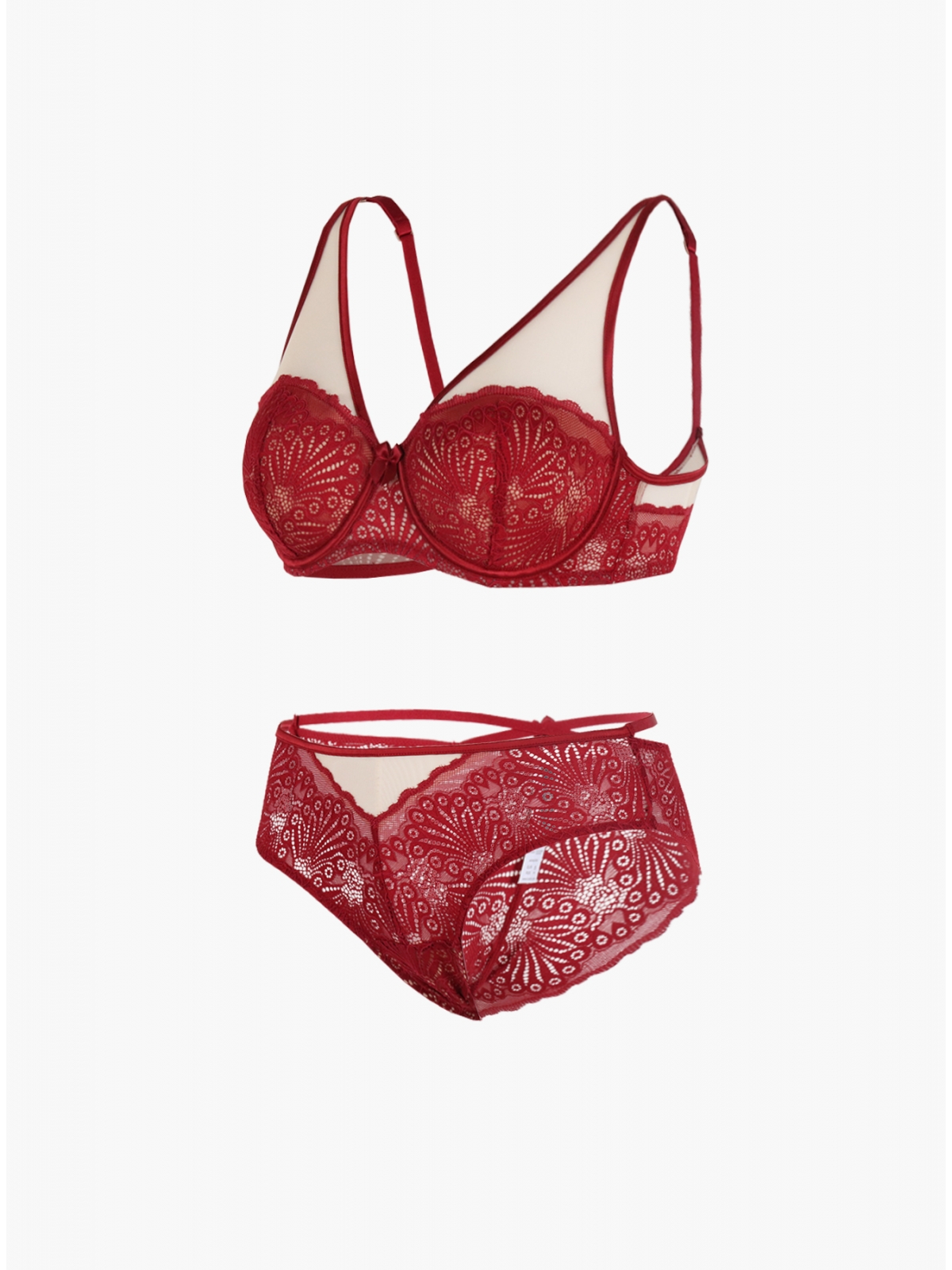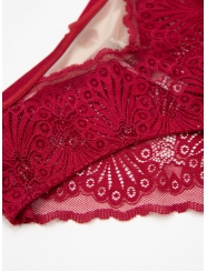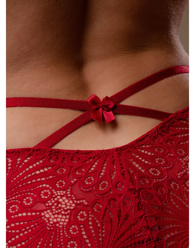 Комплект нижнего белья от торговой марки Индефини. В комплекте бюстгальтер и трусики. Бюстгальтер из кружевной ткани, красного цвета, с декором, на косточках, с небольшим Push-Up, на кружевном поясе, с застежками-крючками, на регулируемых лямках. Трусики-слипы красного цвета, с декором, из кружевной ткани, со вставками из микросетки, на мягкой резинке.