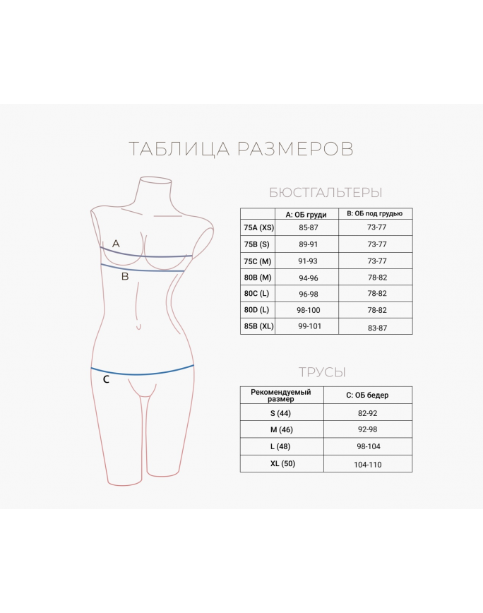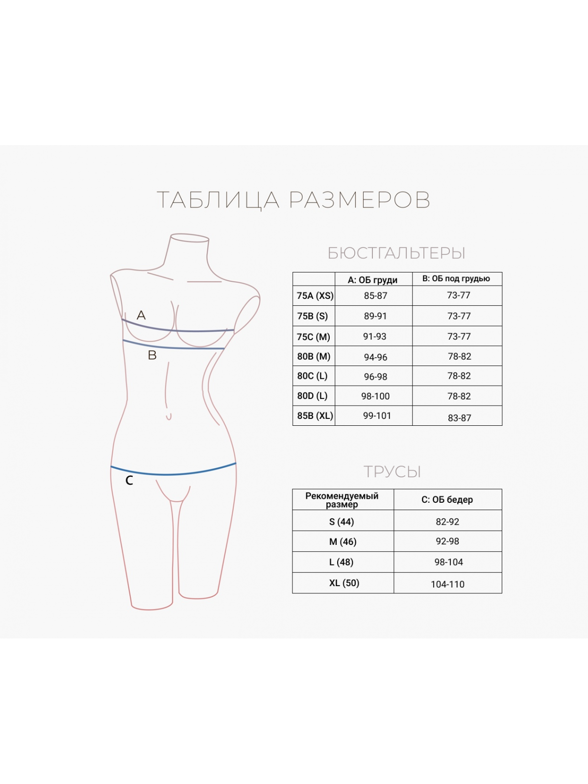 К бюстгальтеру идут трусы слипы, размерами: 75B-S, 75C-M, 80B-M, 80C-L, 85B-XL.
