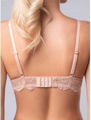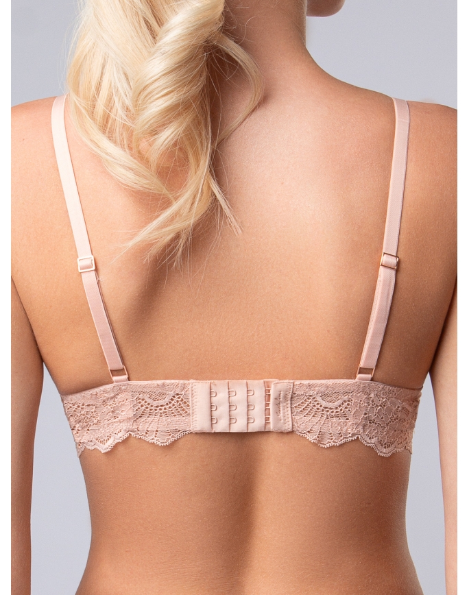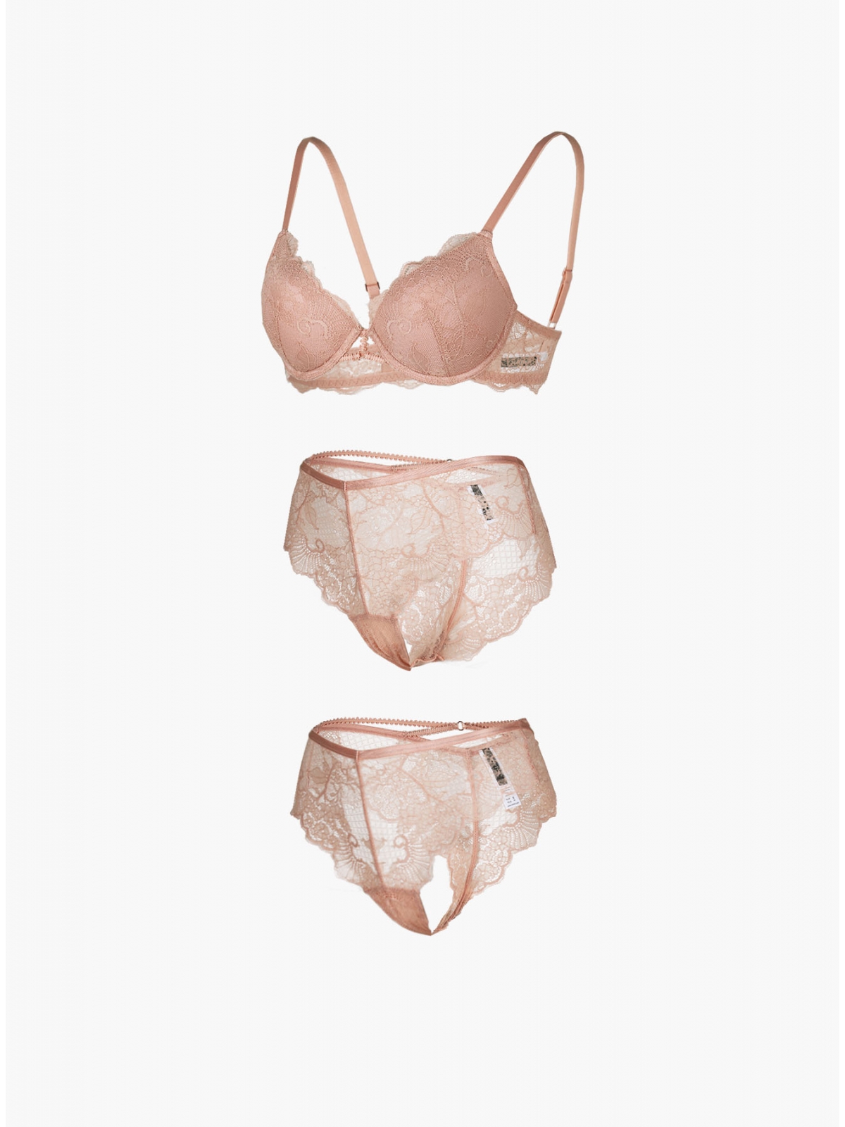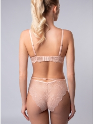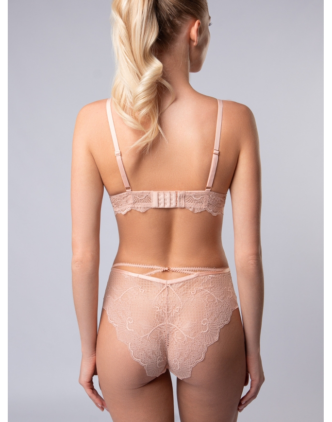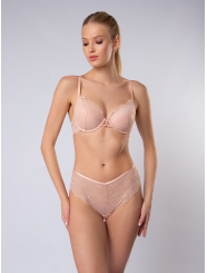 Комплект нижнего белья от торговой марки Индефини. В комплекте бюстгальтер и трусики. Бюстгальтер из кружевной ткани, персикового цвета, на косточках, с тонкой формованной чашкой, с кружевными вставками и обрамлением, на кружевном поясе, лямки регулируются. Трусы, стринги и слипы, из кружевной ткани, персикового цвета, на мягкой резинке.