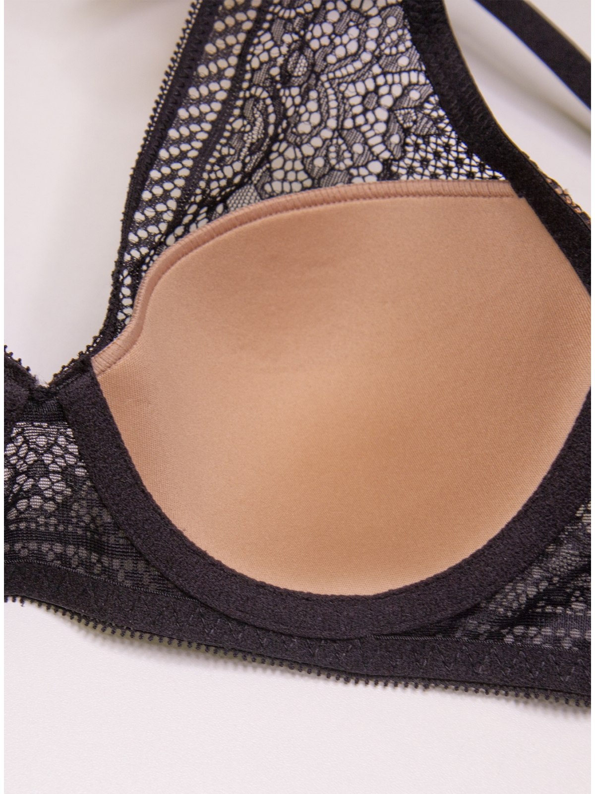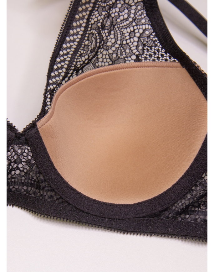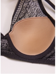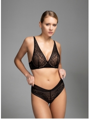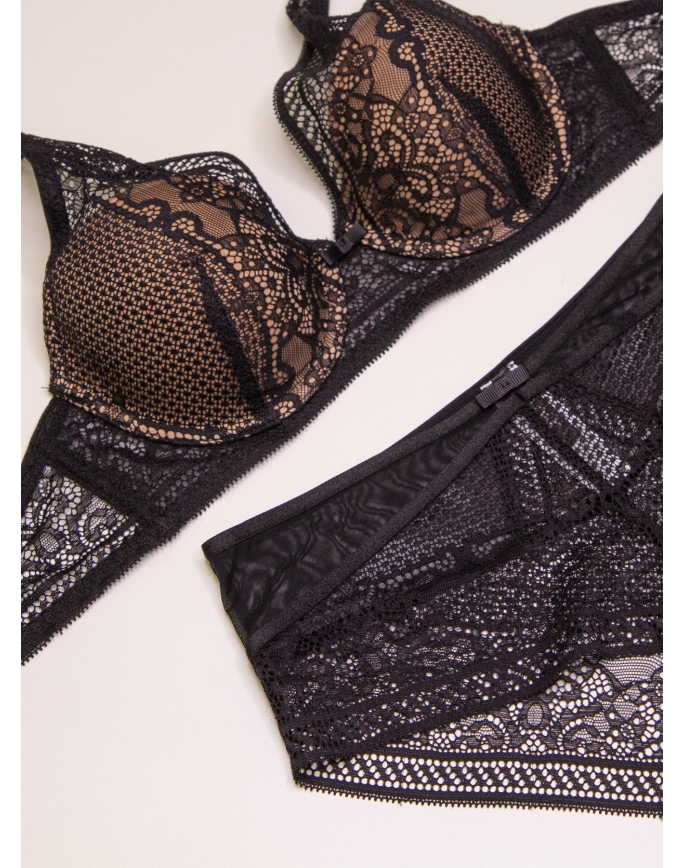 Комплект нижнего белья от торговой марки Индефини. В комплекте бюстгальтер и трусики. Бюстгальтер из полиамида, черного цвета, из кружевной ткани, на косточках, с косточками по бокам, с небольшим Push-up, с обрамлением, на тонких лямках, лямки регулируются. Трусы-слипы из полиамида, черного цвета, из кружевной ткани, с обрамлением, на мягкой резинке, с высокой посадкой.