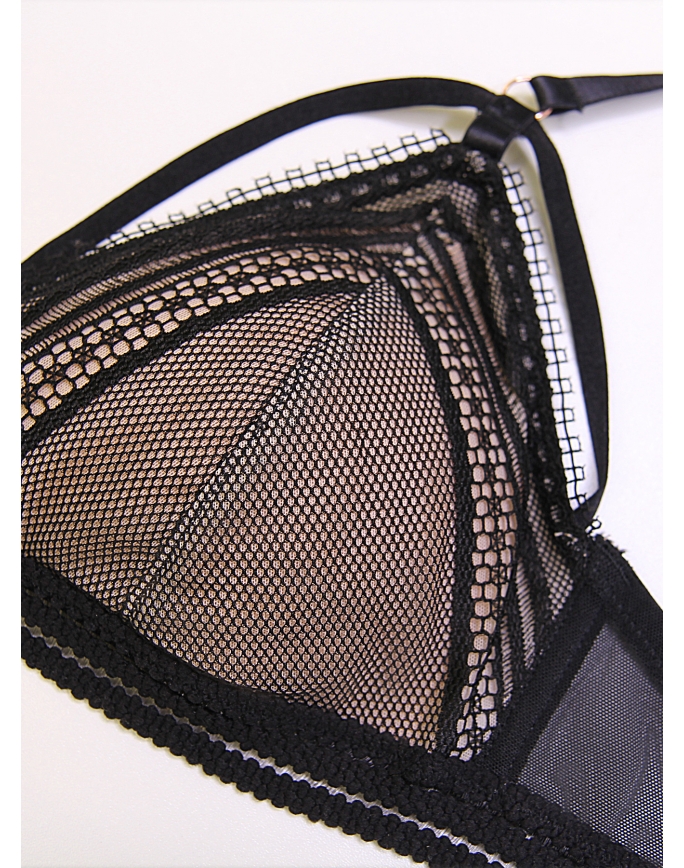 Комплект нижнего белья от торговой марки Индефини. В комплекте бюстгальтер и трусики. Бюстгальтер из полиамида, бежево-черного цвета, без косточек, без Push-up, с мягкой подкладкой, с косточками по бокам, с декоративными вставками, с кружевными вставками и обрамлением, на тонких лямках, лямки регулируются. Трусики, стринги и слипы, из полиамида, черного цвета, из кружевной ткани, с небольшим вырезом сзади, со вставкой, на мягкой резинке, средней посадки.