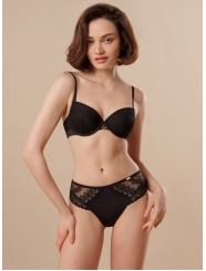 Комплект нижнего белья от торговой марки Индефини. В комплекте бюстгальтер и трусики. Бюстгальтер из полиамида, черного цвета, на косточках, с чашкой-спейсер, без Push-up, с кружевными вставками и обрамлением, на тонких лямках, на застежках, лямки регулируются. Трусики, стринги и слипы, из полиамида, черного цвета, с кружевными вставками и обрамлением, на мягкой резинке, высокой посадки.