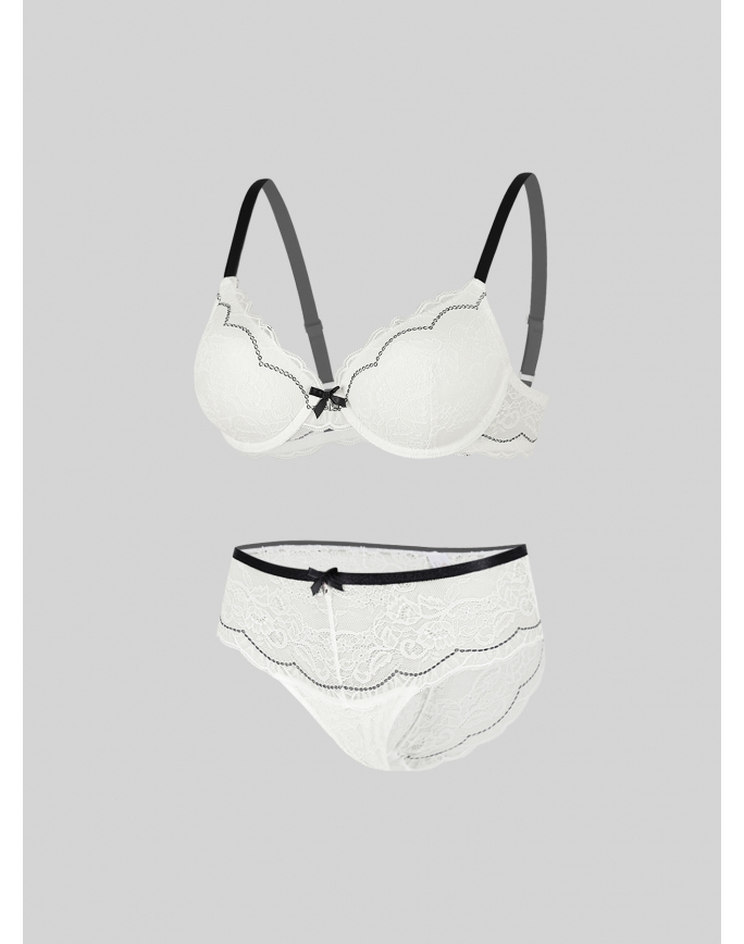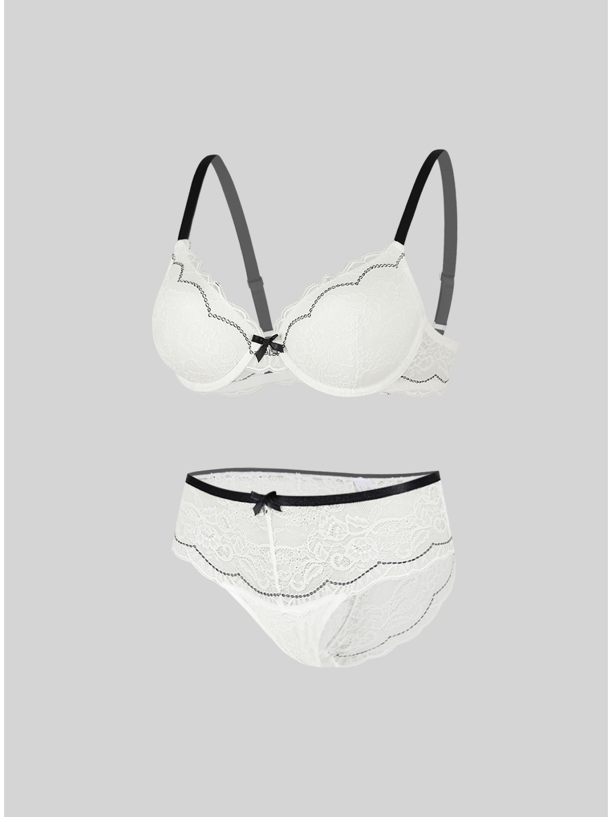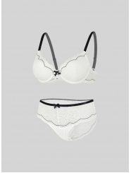 Комплект нижнего белья от торговой марки Индефини. В комплекте бюстгальтер и трусики. Бюстгальтер из полиамида, черно-белого цвета, с кружевными вставками и обрамлением, без Push-up, на косточках, на тонких бретелях, на застежках-крючках, бретели регулируются. Трусы-слипы из полиамида, белого цвета, с кружевными вставками и обрамлением, на мягкой резинке, средней посадки.