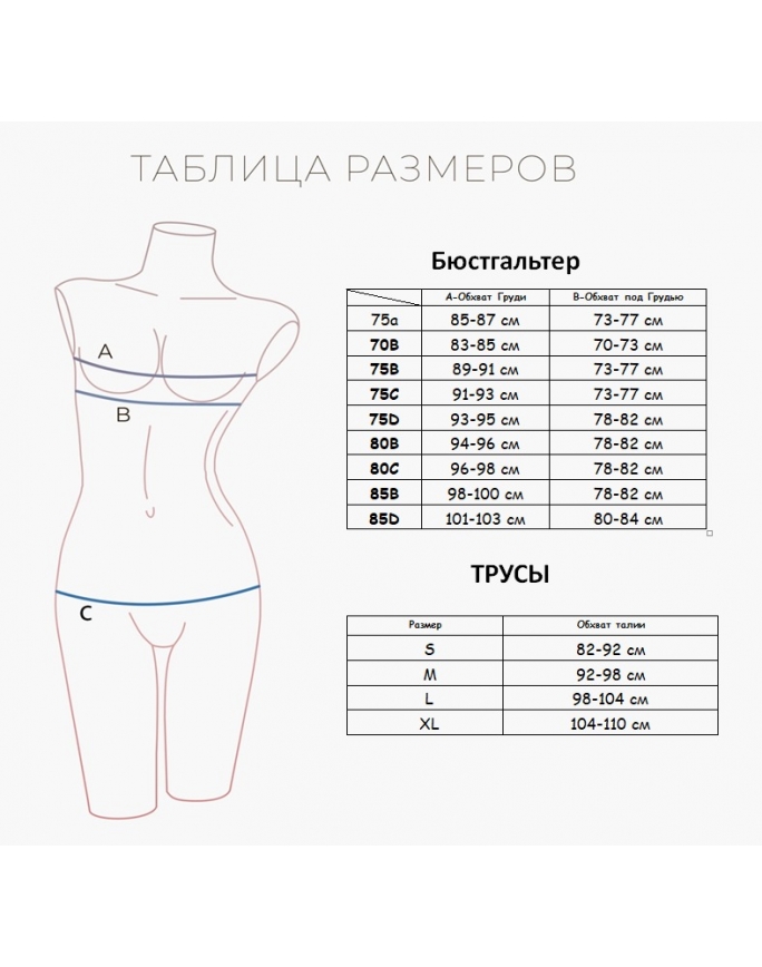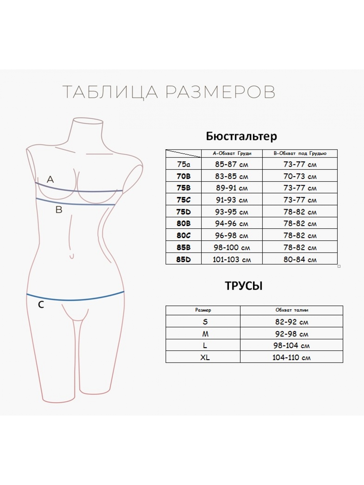 К бюстгальтеру идут трусики, размерами: 75B-S, 75C-M, 75D-L, 80B-M, 80C-L, 80D-XL, 85B-XL, 85C-XL.