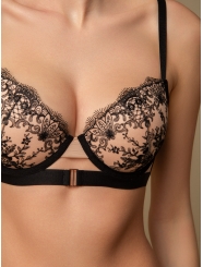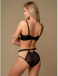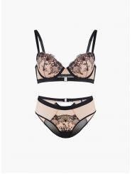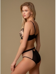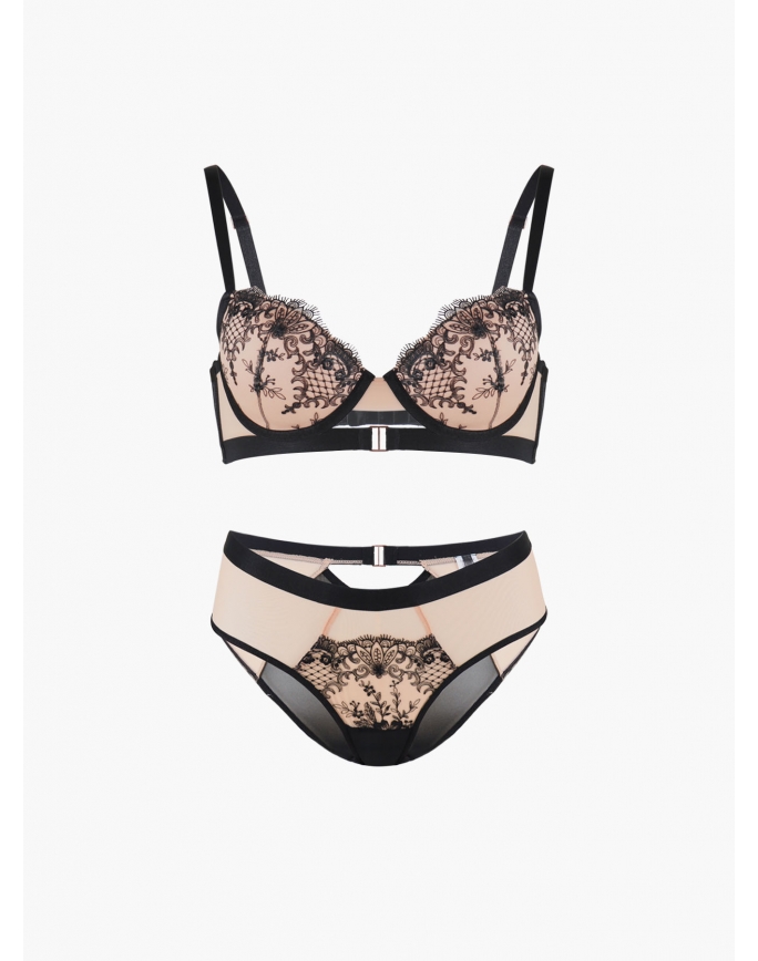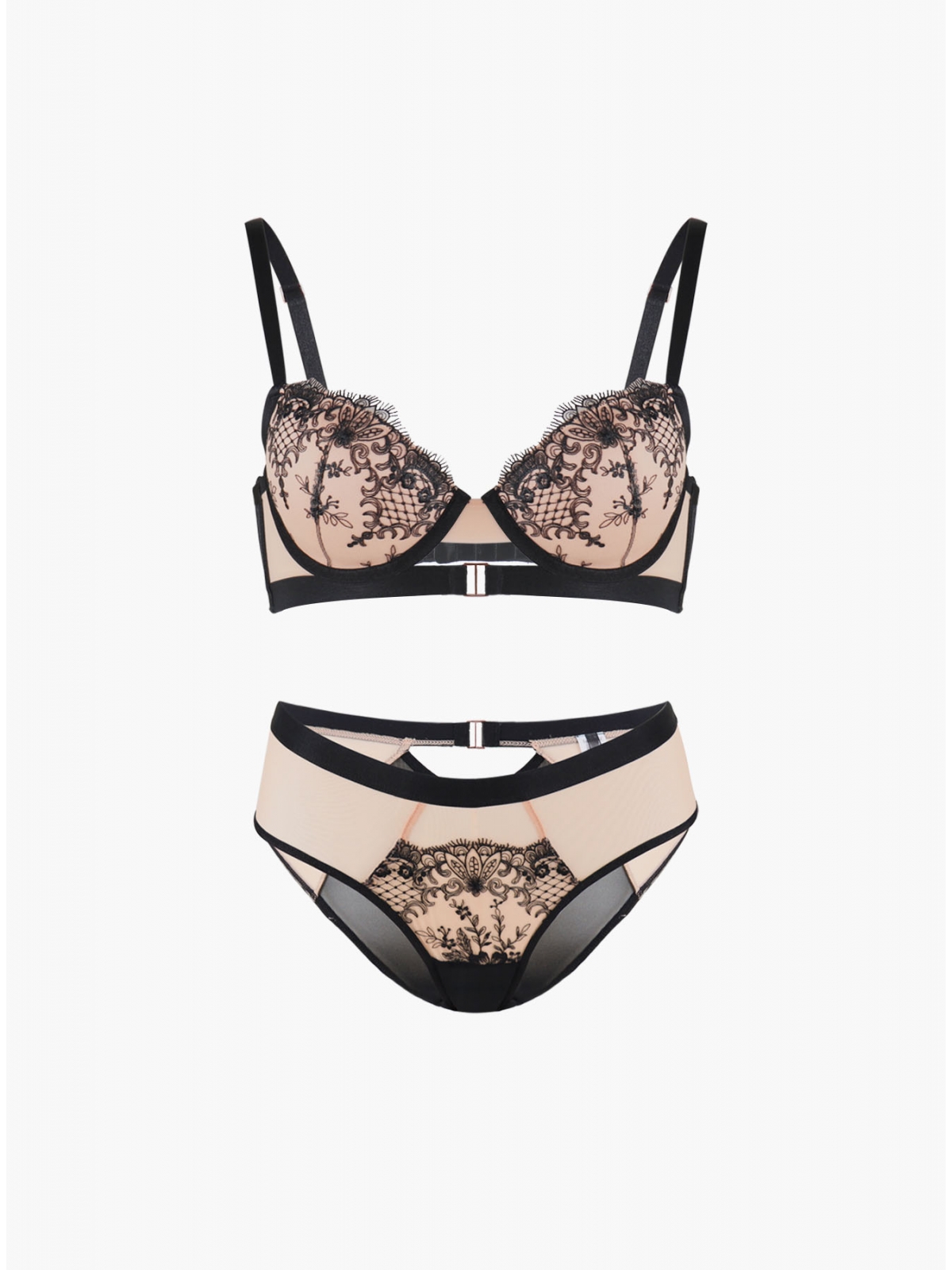 Комплект женского нижнего белья, состоящий из бюстгальтера и трусов-слипов, изготовлен из мягкого и прочного полиамида. Бюстгальтер на косточках без эффекта Push-Up обеспечивает оптимальную поддержку груди, сохраняя её естественные линии. Тонкие регулируемые бретели и застёжка на спине позволяют добиться оптимальной посадки. Шарм бюстгальтеру придают сетчатые вставки и нежные цветочные узоры, которые подчёркивают женственность, а небольшой декоративный элемент спереди добавляет изысканности образу. Трусы-слипы выполнены из полупрозрачной сетчатой ткани с изящными цветочными узорами спереди, что придаёт им соблазнительный вид. Средняя посадка гарантирует удобство, а хлопковая ластовица внутри обеспечивает здоровье и комфорт в течение всего дня. Мягкая эластичная резинка обеспечивает комфортную посадку, не создавая давления. Сзади трусы украшены треугольным вырезом и декоративным элементом, добавляющим нотку игривости и утончённости.