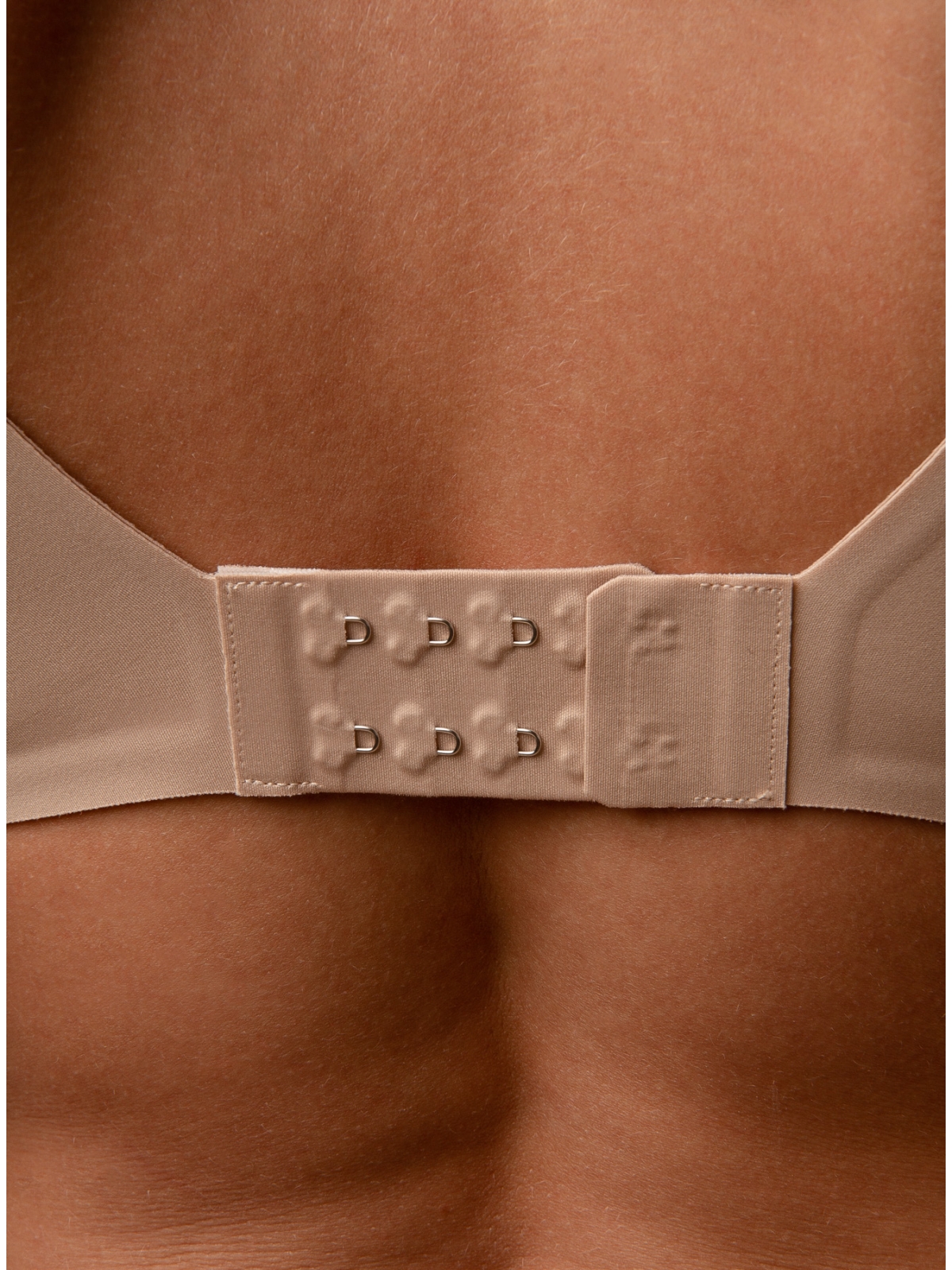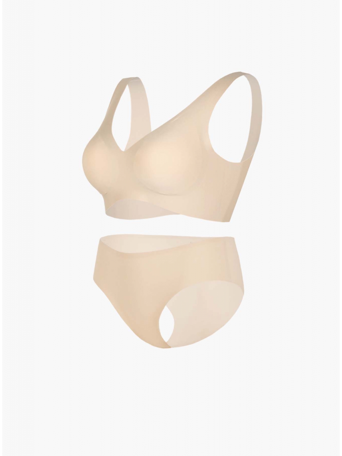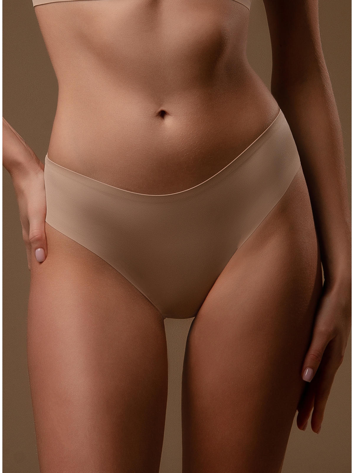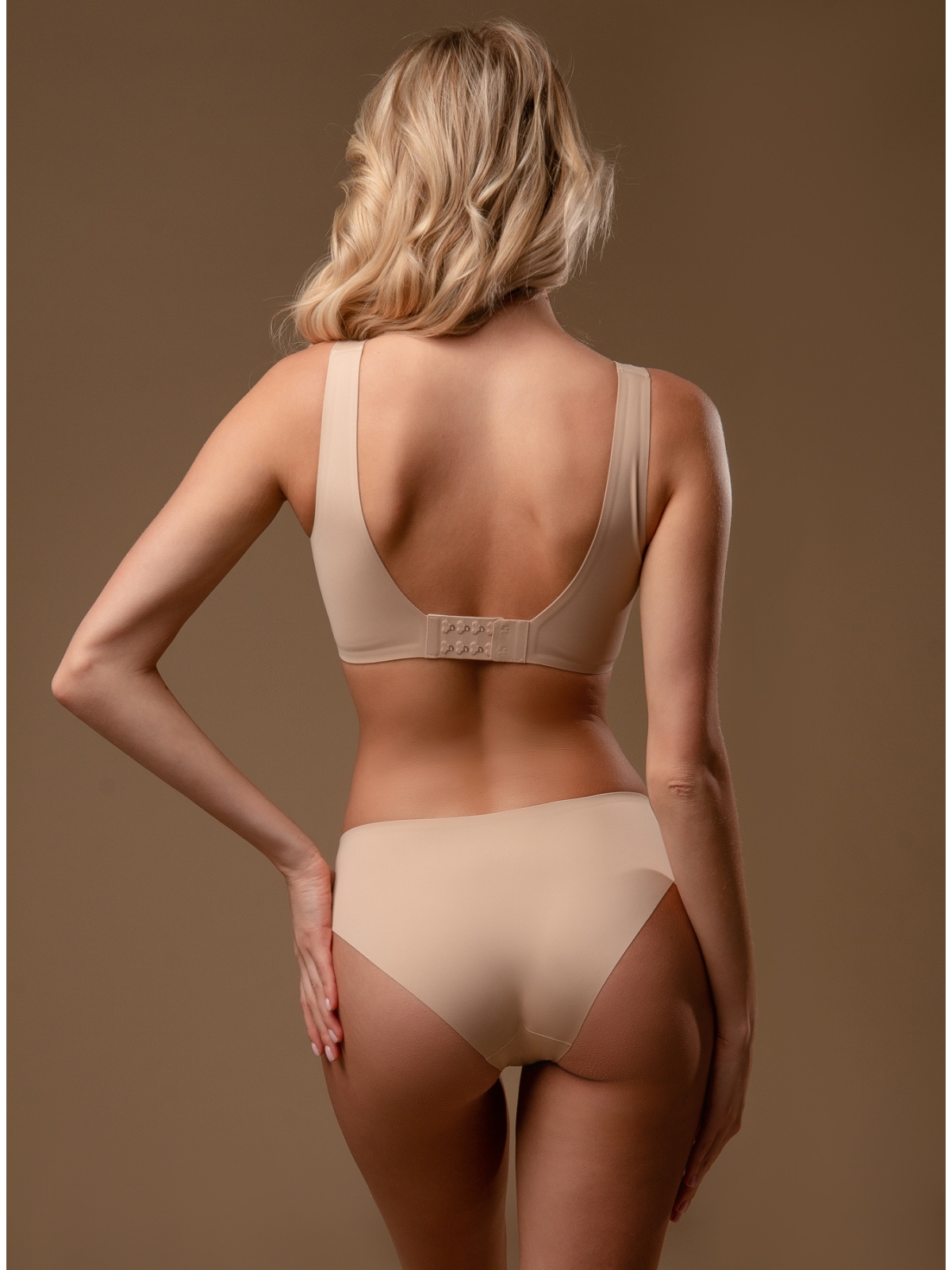 Комплект нижнего белья от торговой марки Индефини. В комплекте бюстгальтер и трусики. Бюстгальтер-топ бежевого цвета изготовлен из эластичной синтетической ткани с высококачественным клеевым краем, с отсутствием швов, дополнен мягкими чашками-вкладышами без Push-up, без косточек, на широких бретелях, объем под грудью регулируется застежкой на крючках. Трусы-слипы бежевого цвета, изготовлены из эластичной синтетической ткани с высококачественной клеевой обработкой срезов, дополнены гигиенической хлопковой ластовицей, средней посадки.