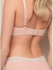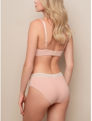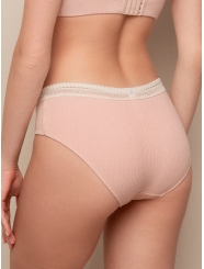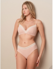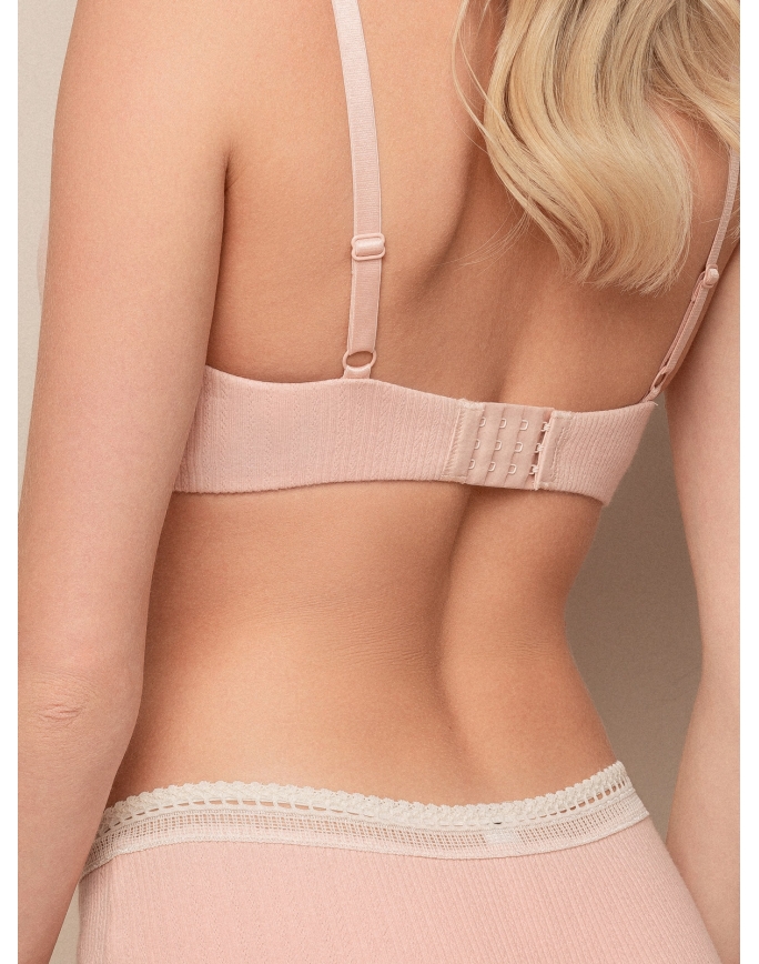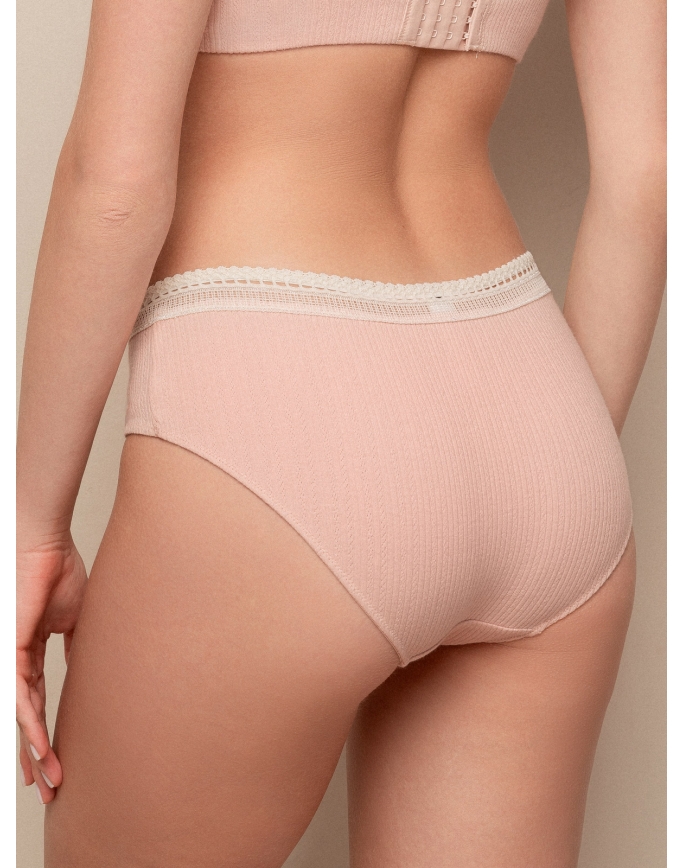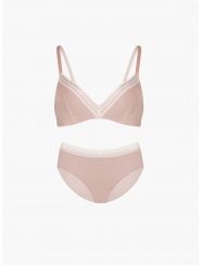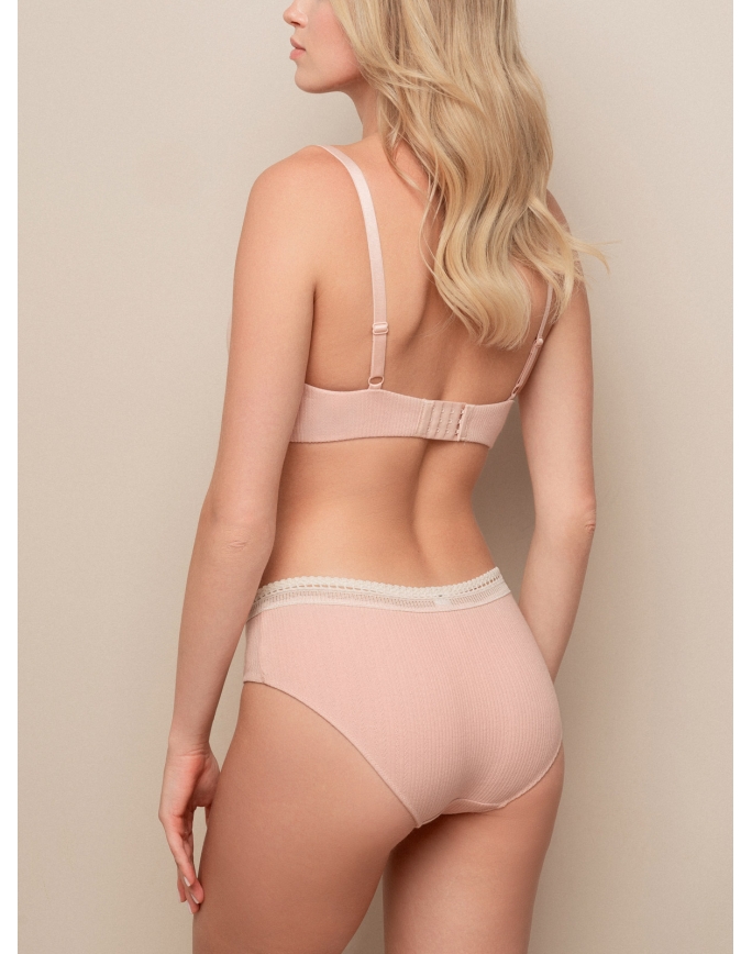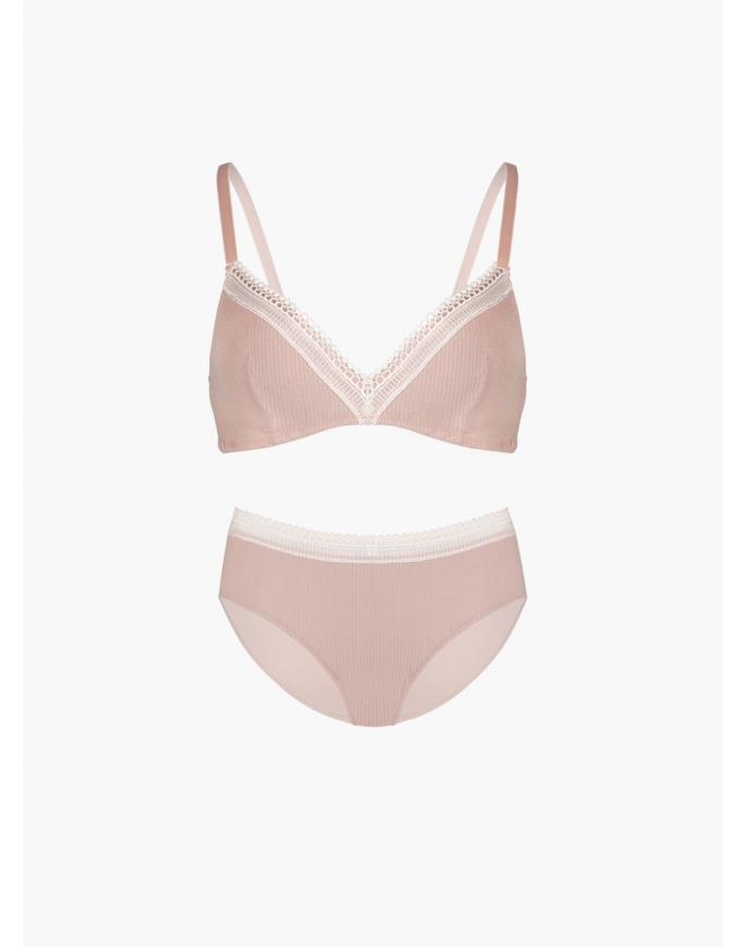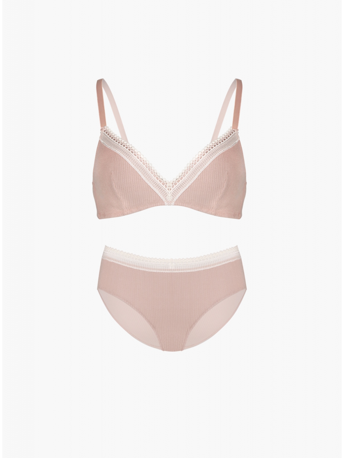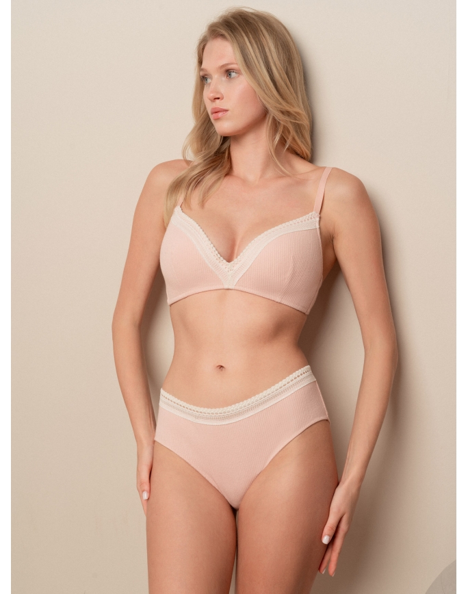 Комплект, изготовленный из хлопка, состоит из бюстгальтера и трусов-слипов. Бюстгальтер без косточек изготовлен из хлопка. Поролоновые чашки без Push-up, на тонких регулируемых бретелях, сзади застежки на крючках. Чашки обрамлены кружевом. Внутренняя часть чашки - формованный поролон валиком под форму груди. Трусы слипы женские изготовлены из хлопка. Средней посадки, на мягкой кружевной резинке, фактура ткани в рубчик. На внутренней стороне трусов имеется хлопковая ластовица.