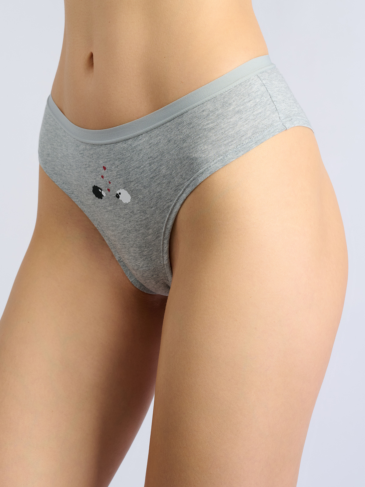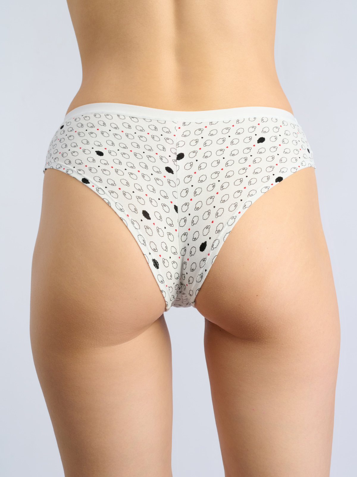 На лицевой стороне трусов нанесён принт с изображением овечек: на серых — две овечки (черная и белая) с красными сердечками между ними, на белых — повторяющийся узор из черных и белых овечек с красными точками.