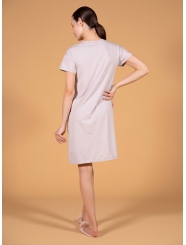 Женская сорочка от торговой марки Индефини. Сорочка из бамбука, серого цвета, с принтом в горошек, с принтом-нашивкой, с короткими рукавами, с круглым вырезом горловины, длинной до колена, свободного кроя.