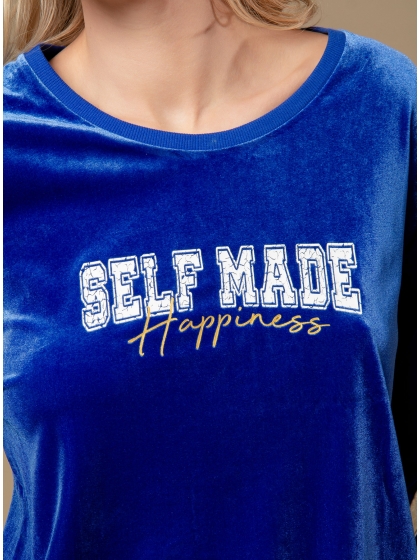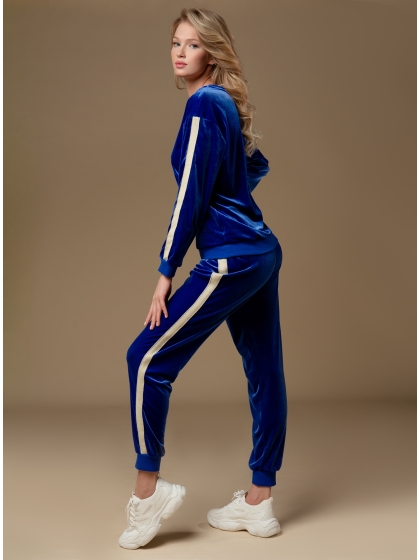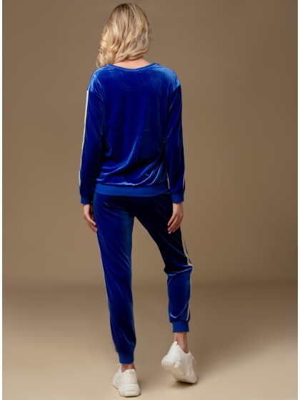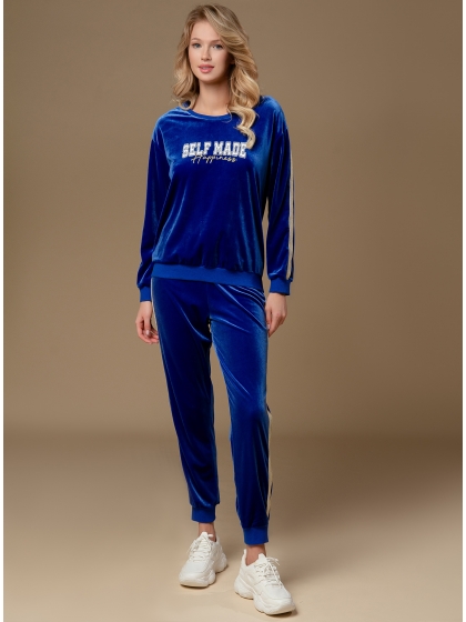 Костюм женский, изготовленный из смесовой ткани и выполненный в синем цвете, состоит из рубашки и шо.....