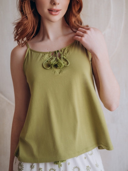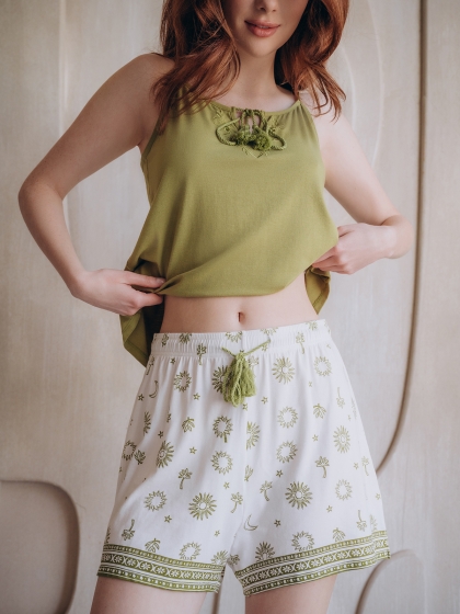 Пижама женская изготовлена из полиэстера с добавлением хлопка и вискозы. В комплекте майка с шортами.....