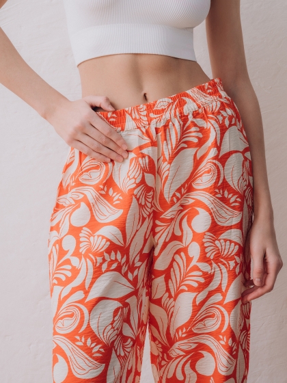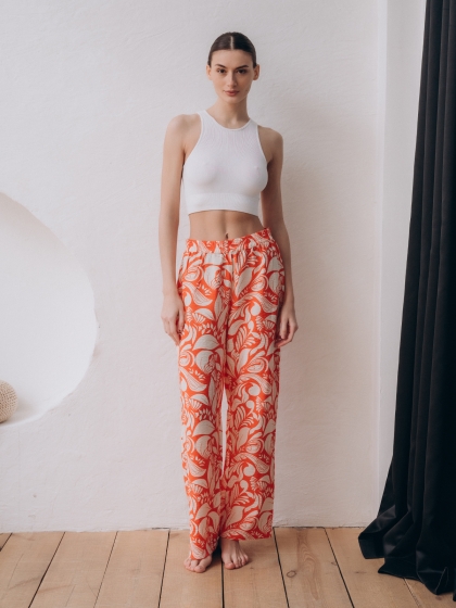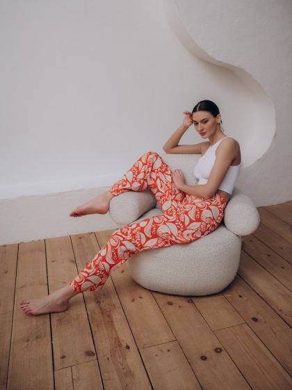 Женские домашние брюки изготовлены из смесовой ткани и выполнены в оранжевом цвете. Брюки прямог.....