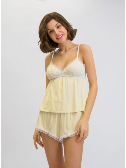 Пижама женская изготовлена из смесового трикотажа. Она состоит из майки и шорт. Майка выполнена в зе.....