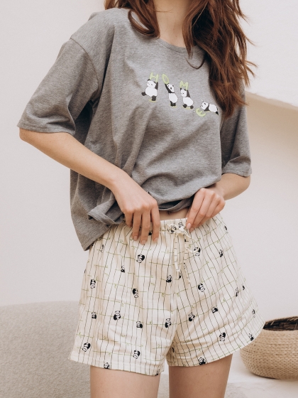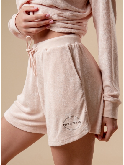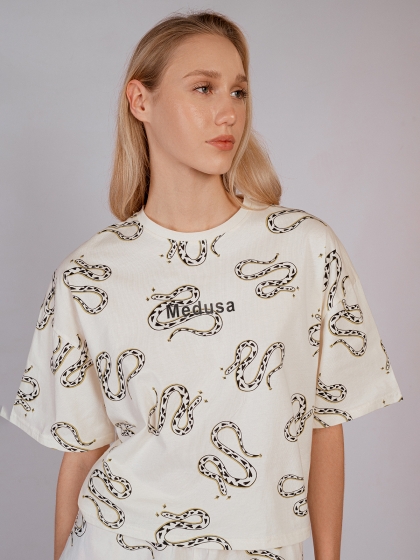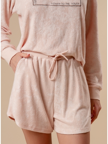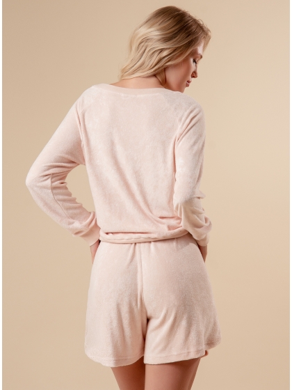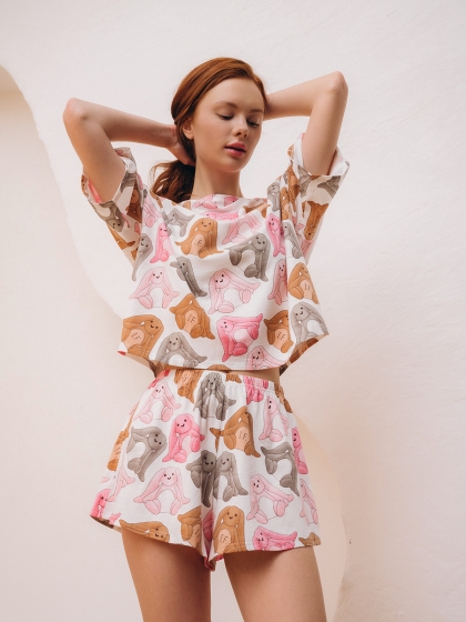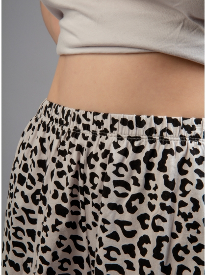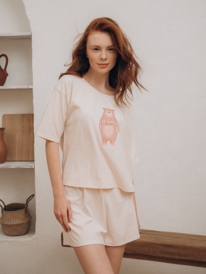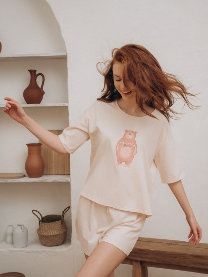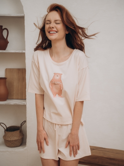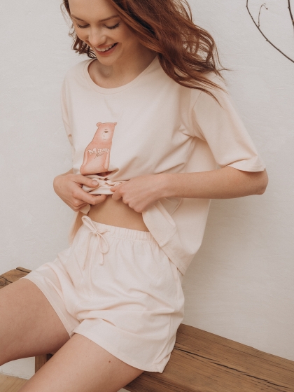 Эта пижама состоит из топа и шорт. Выполнена в светлом бежевом оттенке с нежным принтом. Модель п.....
