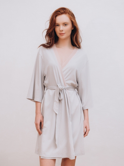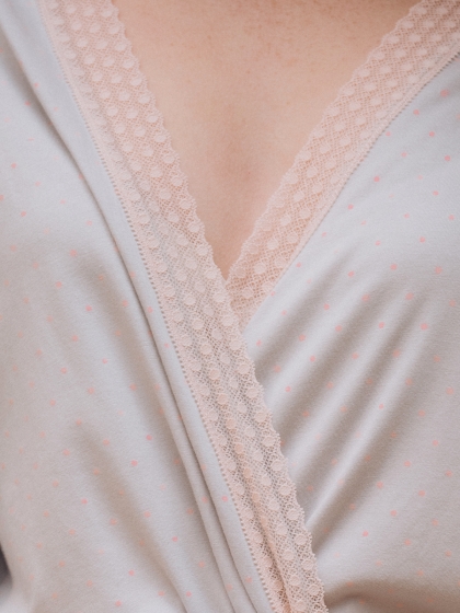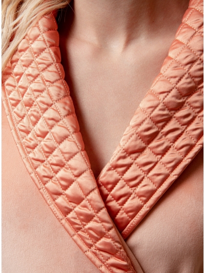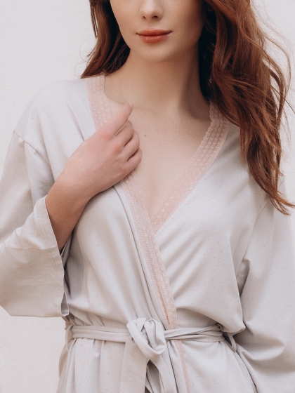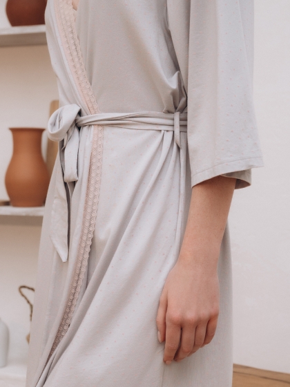 Халат выполнен в светлом базовом оттенке с рельефной текстурой. Украшен мелким нежным принтом с повт.....