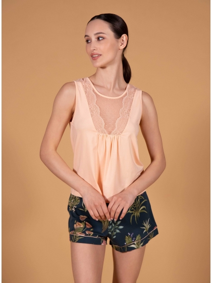 Пижама женская изготовлена из полиэстера с добавлением хлопка и вискозы. В комплекте майка с шортами.....