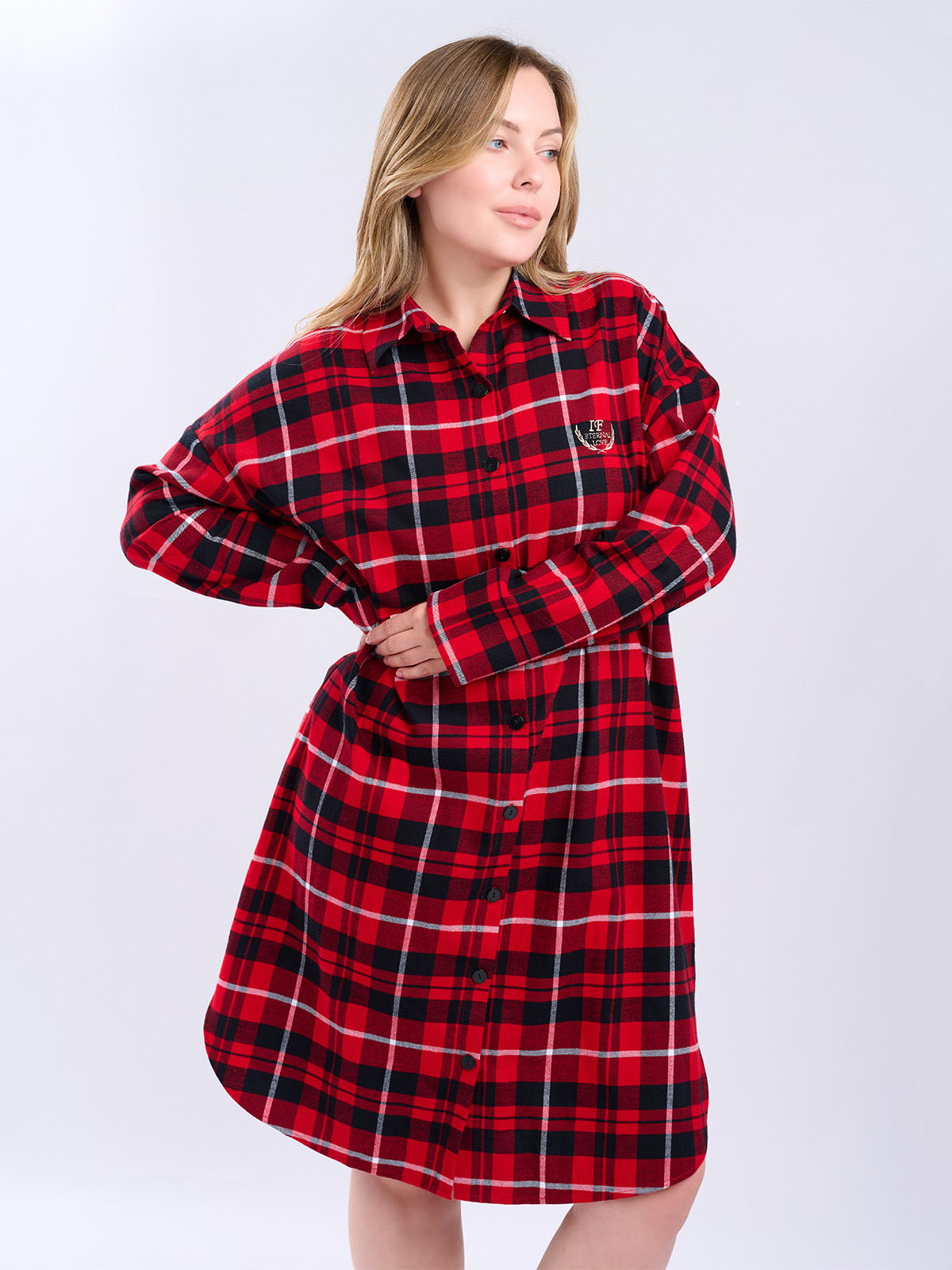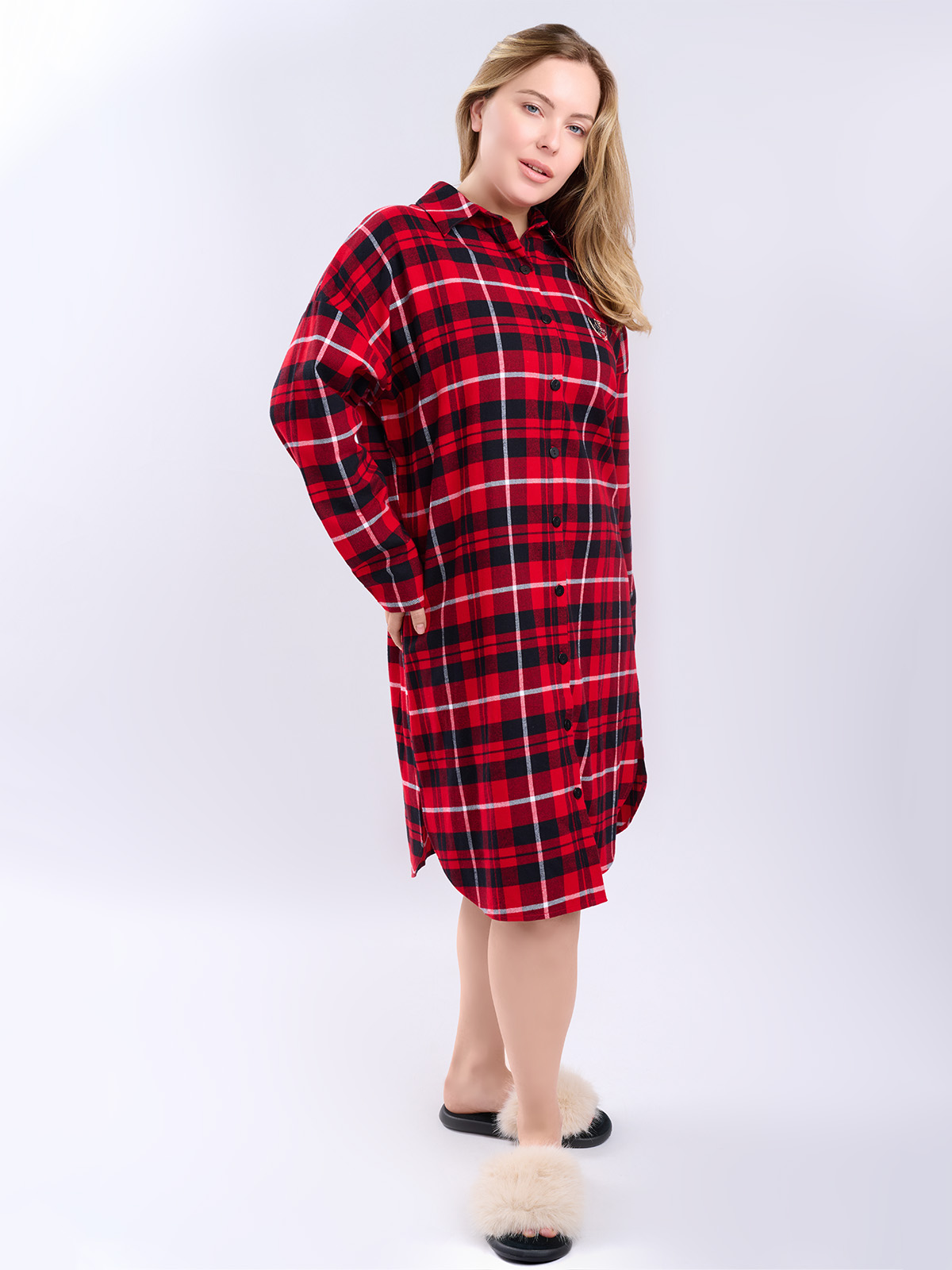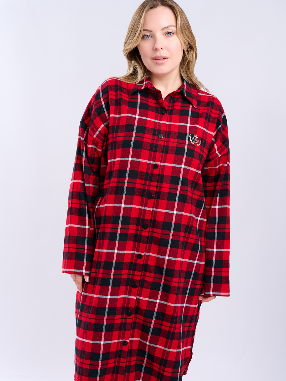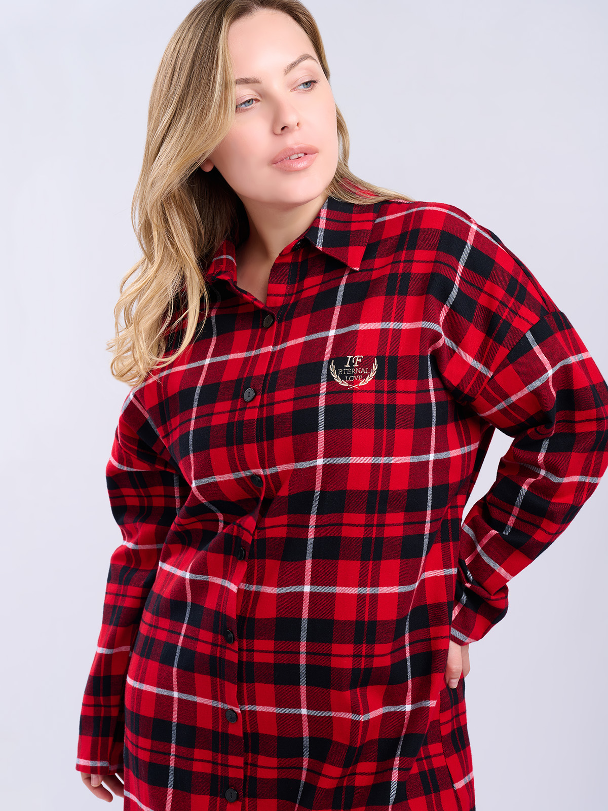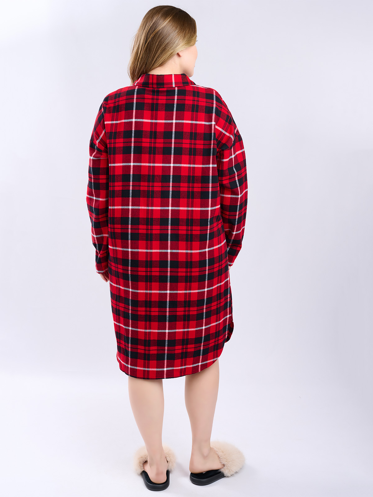 Сорочка в красно-черную клетку, свободного кроя с длинными рукавами и отложным воротником.