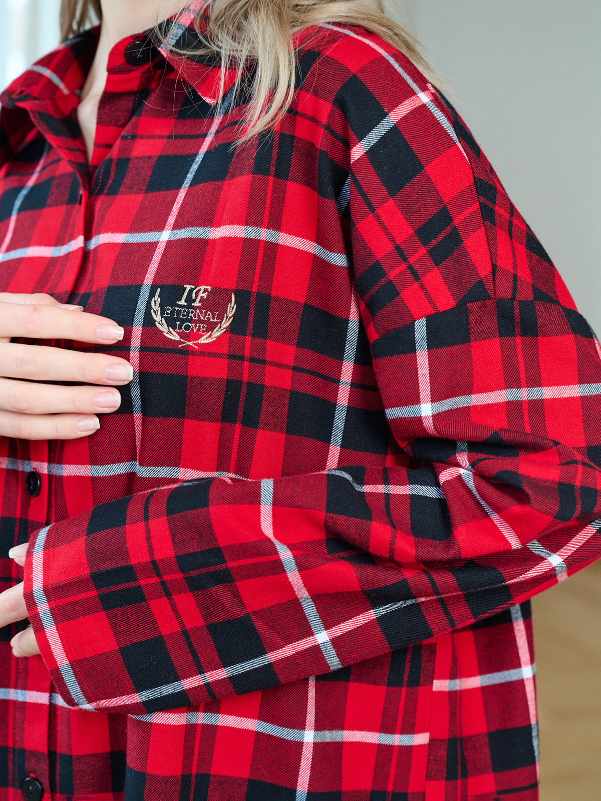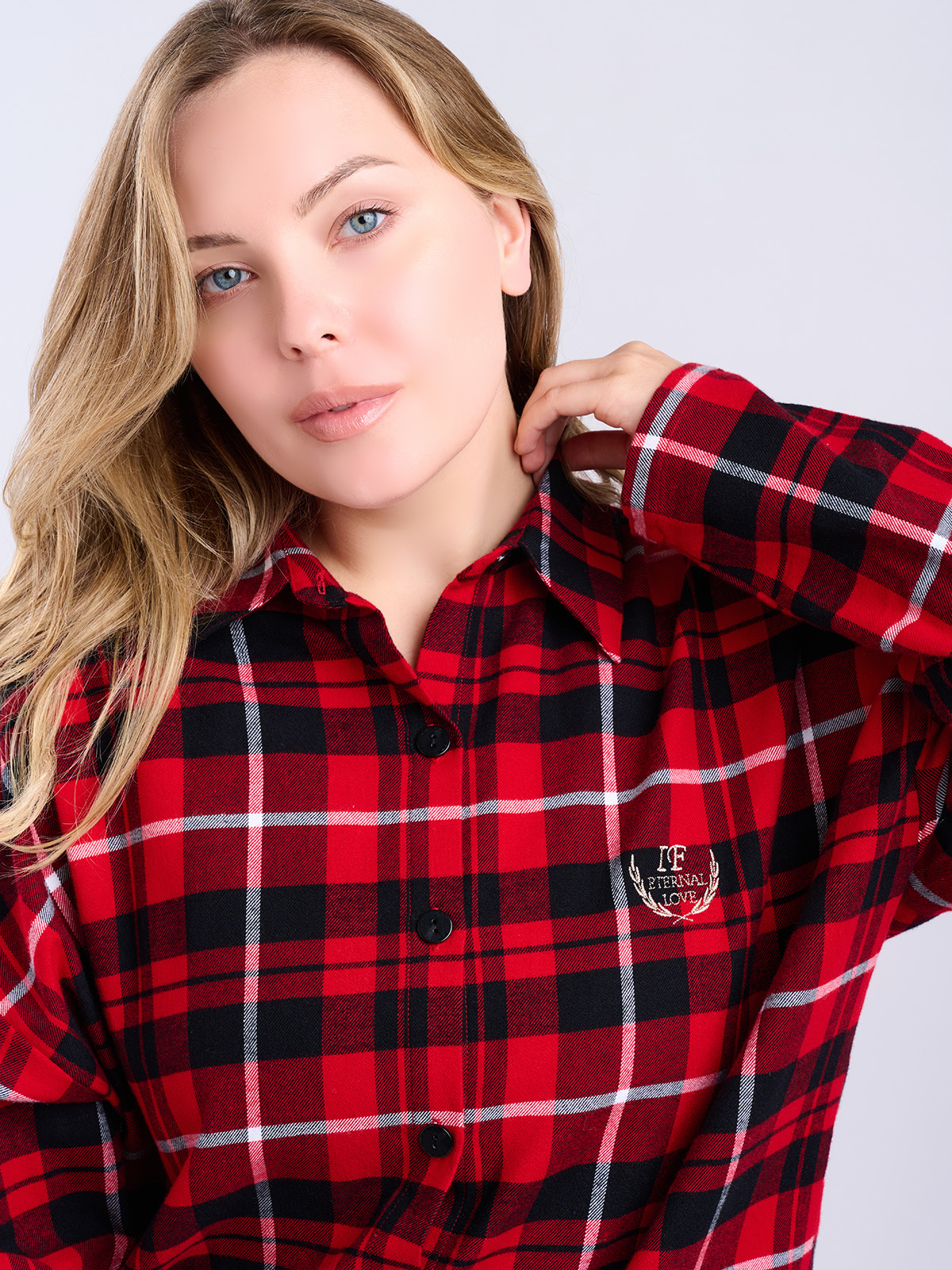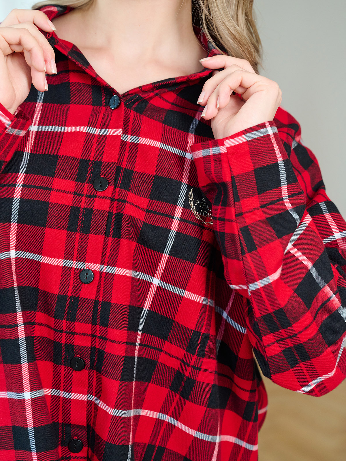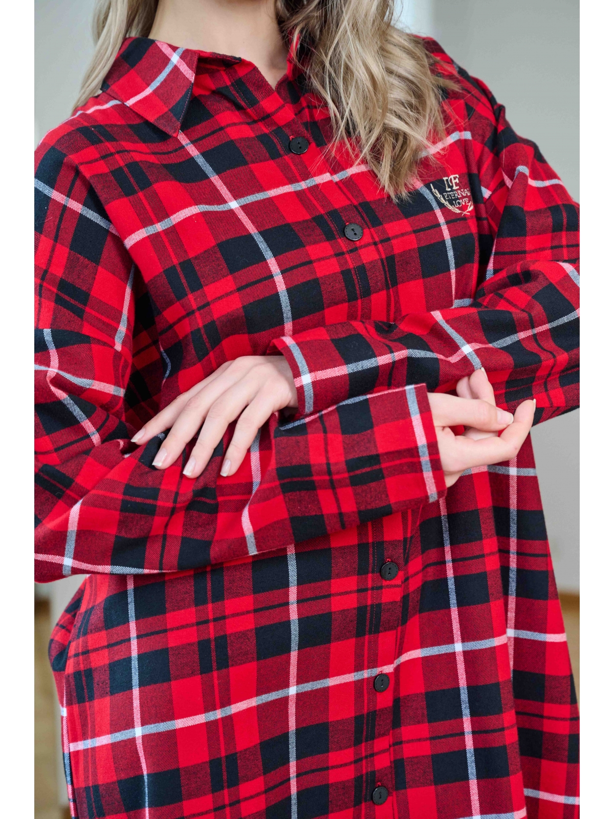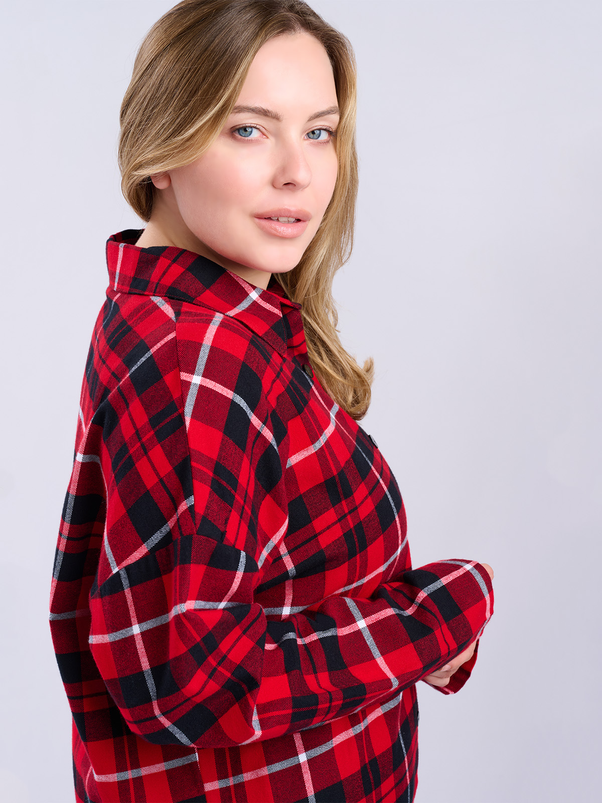 Сорочка в красно-черную клетку, свободного кроя с длинными рукавами и отложным воротником.